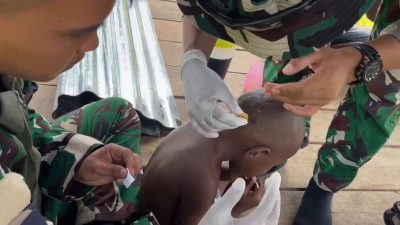 BAROMETER99, Mappi- Satgas Yonif 125/Si’mbisa Pos Venaha melaksanakan karya bhakti membersihkan lingkungan sekitar puskesmas di Kampung Sahapikya, Distrik Venaha, Kabupaten Mappi. Sabtu (06/07/2024).