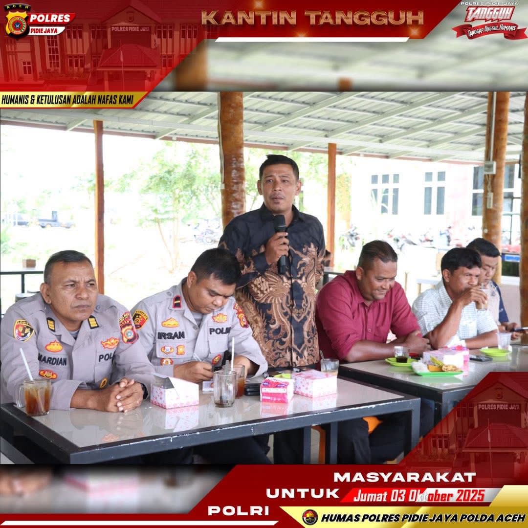 Pidie Jaya, Barometer99.com โ€“ Dalam rangka memperkuat sinergi dan memastikan pelaksanaan pemilihan keuchik serentak (Pilchiksung) berjalan aman, tertib, dan demokratis, Kapolres Pidie Jaya AKBP Ahmad Faisal Pasaribu, S.H., S.I.K., M.H., menggelar kegiatan Jumat Curhat Presisi bersama Ketua Panitia Pemilihan Keuchik (P2K) Kecamatan Trienggadeng dan Panteraja. Kegiatan berlangsung pada Jumat (3/10/2025) di Kantin Tangguh Polres Pidie Jaya, Gampong Teungklut, Kecamatan Trienggadeng, Kabupaten Pidie Jaya.