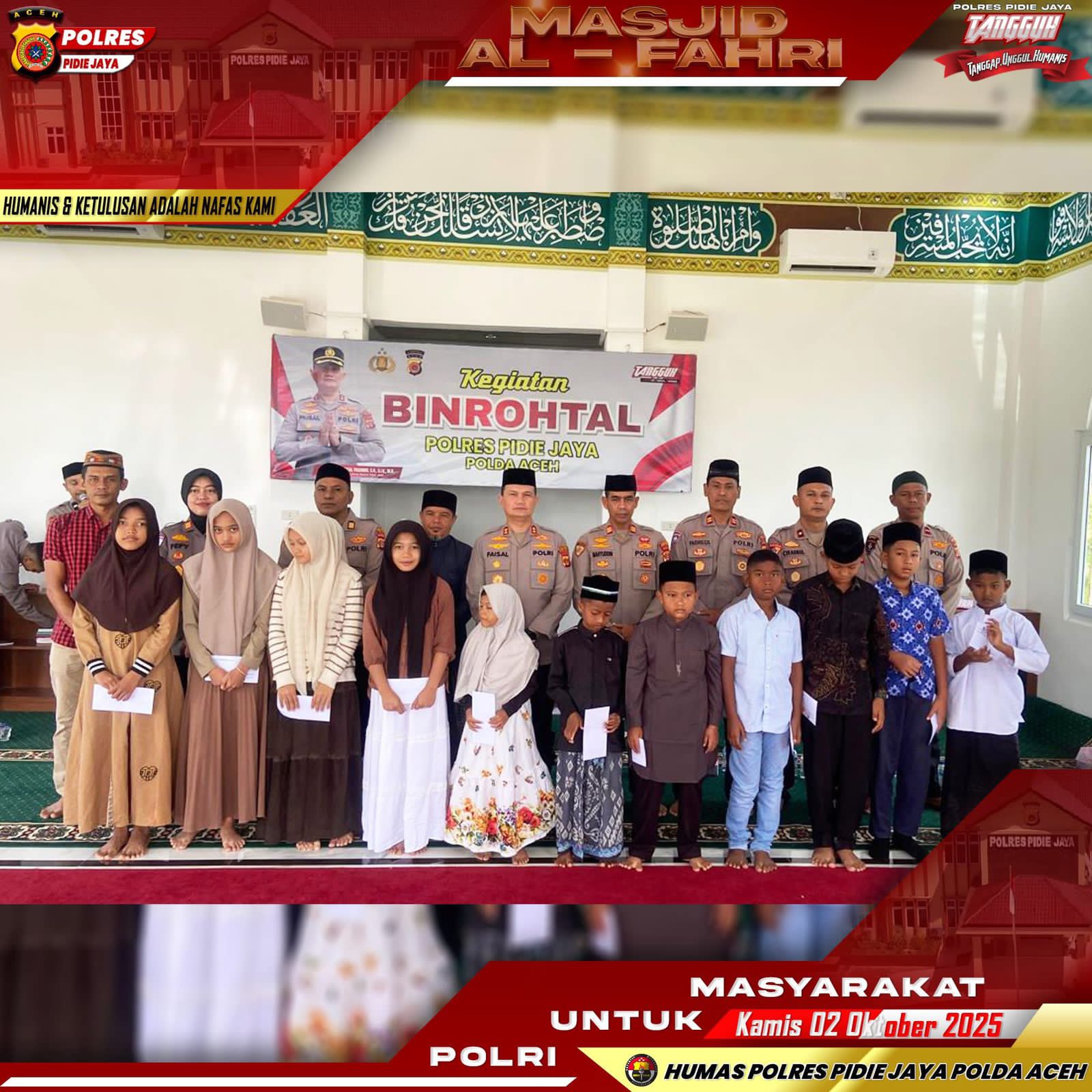 Barometer99.com – Kepala Kepolisian Resor Pidie Jaya AKBP Ahmad Faisal Pasaribu, S.H., S.I.K., M.H. Turut Melaksanakan Kegiatan Binrohtal dan Berikan Santunan Kepada Anak Yatim, bertempat di masjid Al-Fahri (24/9)
