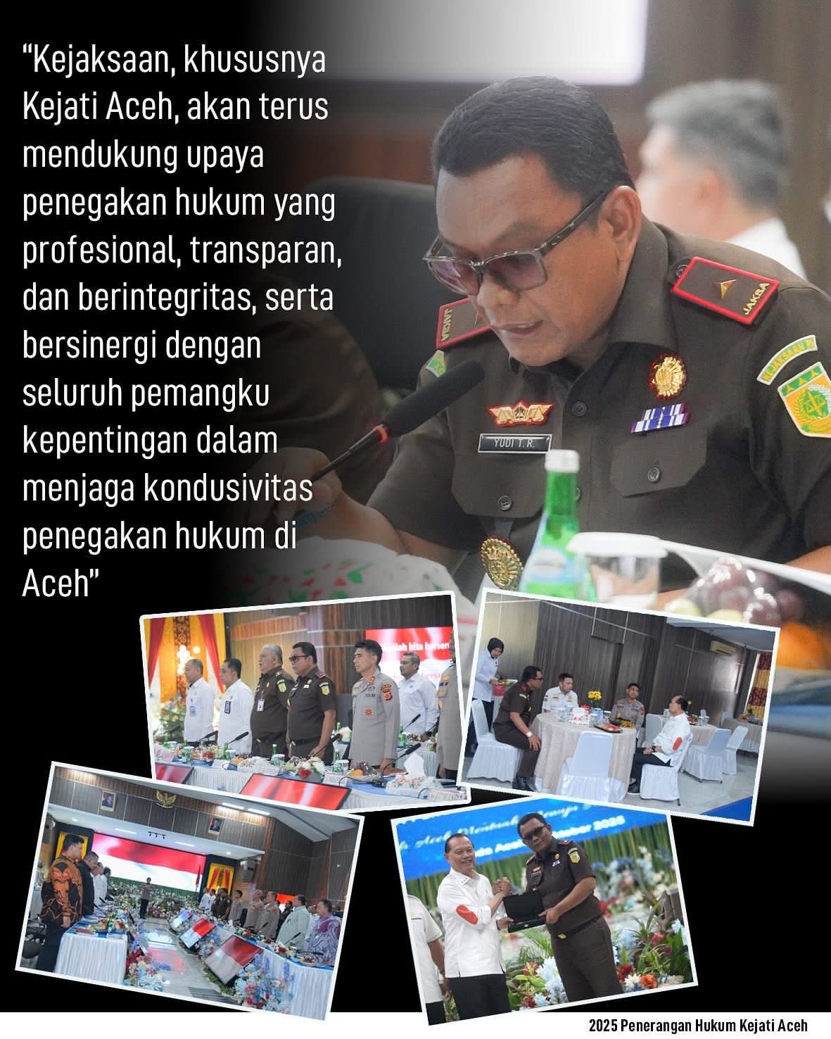 Kajati Aceh juga menegaskan komitmen Kejaksaan untuk terus mendukung upaya penegakan hukum yang profesional, transparan, dan berintegritas serta bersinergi dengan seluruh pemangku kepentingan dalam menjaga kondusivitas penegakan hukum di Aceh.
