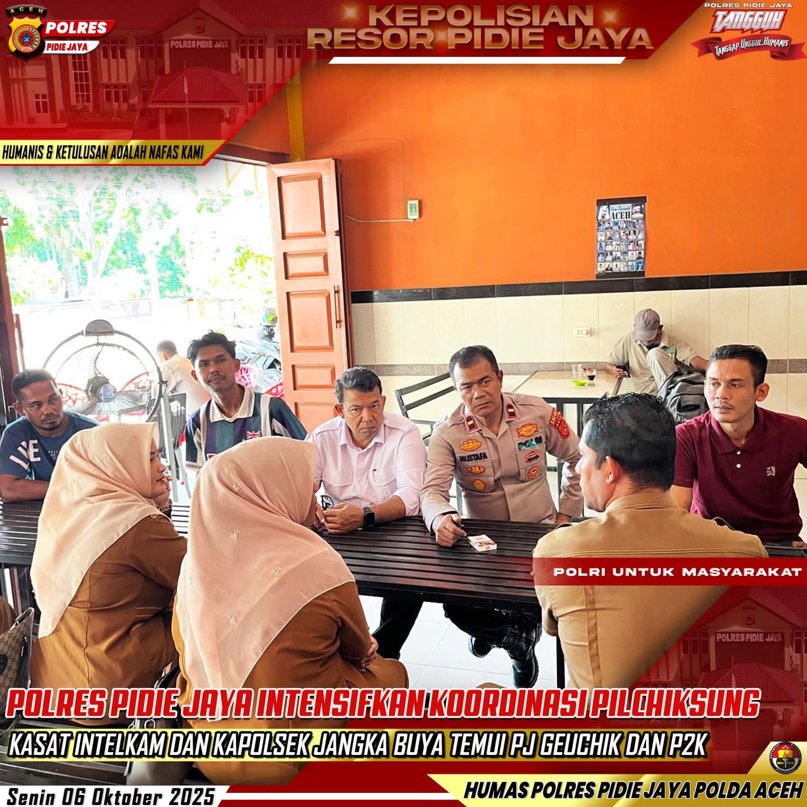 Kapolres Pidie Jaya AKBP Ahmad Faisal Pasaribu, S.H., S.I.K., M.H., melalui Kasi Humas AKP Mahruzar Hariadi, menjelaskan bahwa kegiatan ini merupakan langkah proaktif Polri untuk memperkuat sinergi dan komunikasi dengan penyelenggara Pilchiksung di tingkat akar rumput.