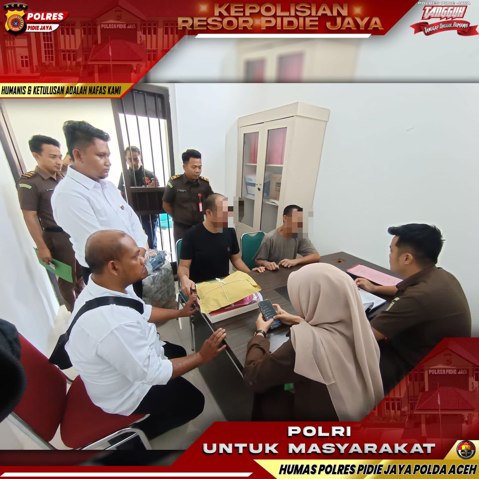 Penyerahan dilakukan di Kantor Kejaksaan Negeri Pidie Jaya dan diterima langsung oleh Jaksa Penuntut Umum. Dua tersangka yang diserahkan masing-masing berinisial MI (45), warga Kecamatan Manggeng, Kabupaten Aceh Barat Daya dan FD (54), warga Kecamatan Simpang Mamplam, Kabupaten Bireuen.