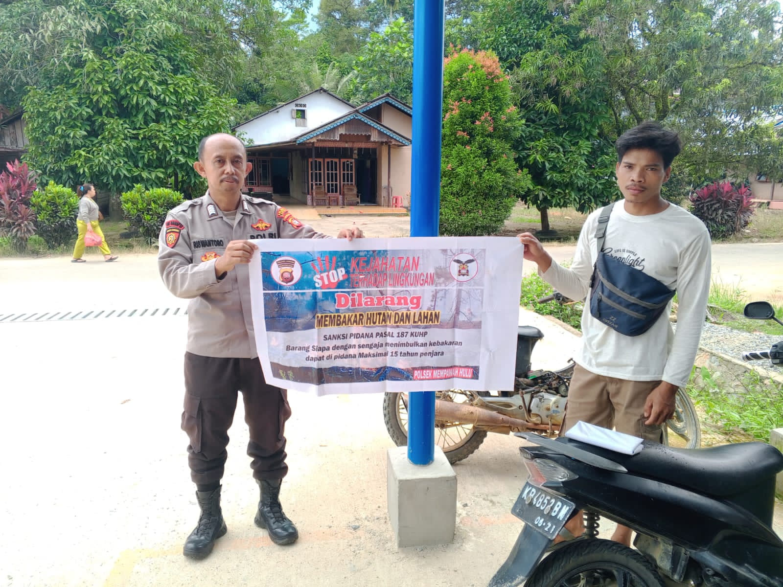 Dengan mengunakan Banner, Bripka Riswantoro Ajak Warga tidak Melakukan Pembakaran Hutan dan Lahan