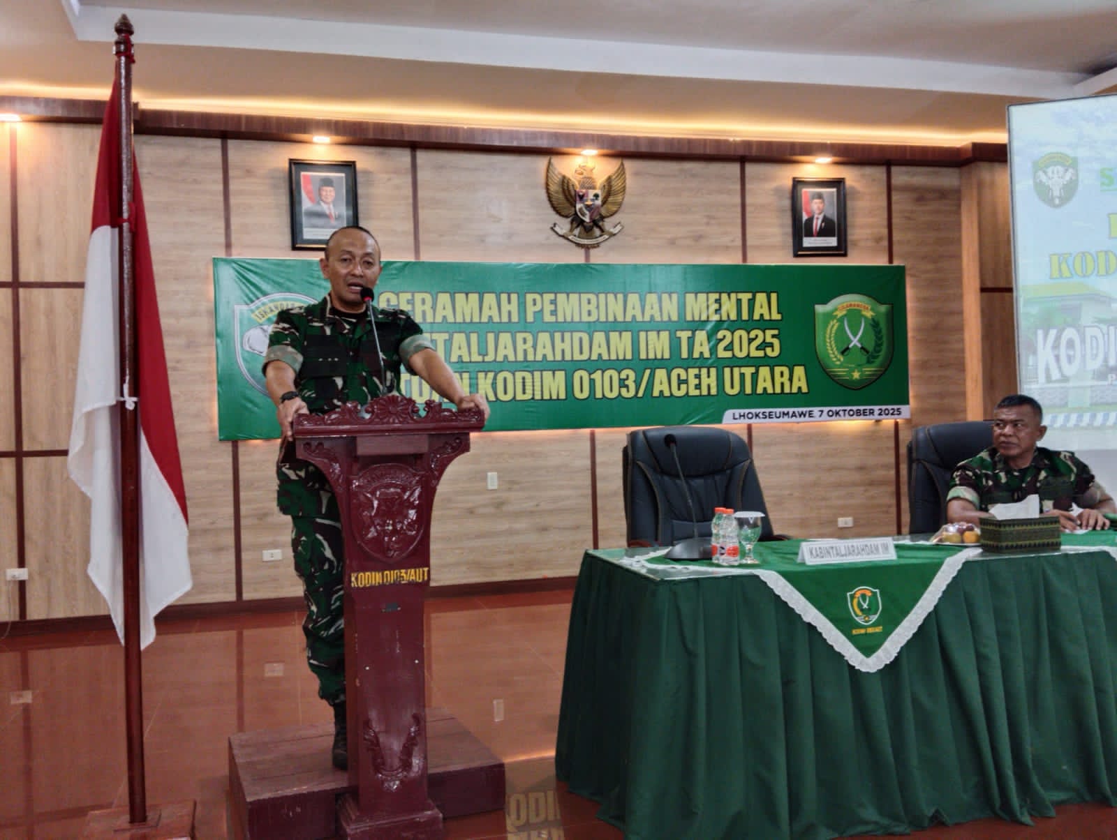 Lhokseumawe, Barometer99.com – Dalam rangka meningkatkan keimanan, ketakwaan, dan moralitas personel, Kodim 0103/Aceh Utara melaksanakan kegiatan Ceramah Pembinaan Mental Bintaljarahdam Iskandar Muda Tahun Anggaran 2025, bertempat di Aula Sapta Marga, Jalan Iskandar Muda, Kelurahan Kampung Jawa Lama, Kecamatan Banda Sakti, Kota Lhokseumawe, Rabu (8/10/2025). Kegiatan ini diikuti oleh unsur pimpinan, perwira, Bintara, Tamtama, PNS, serta pengurus Persit KCK Cabang XX Dim 0103/Aceh Utara.