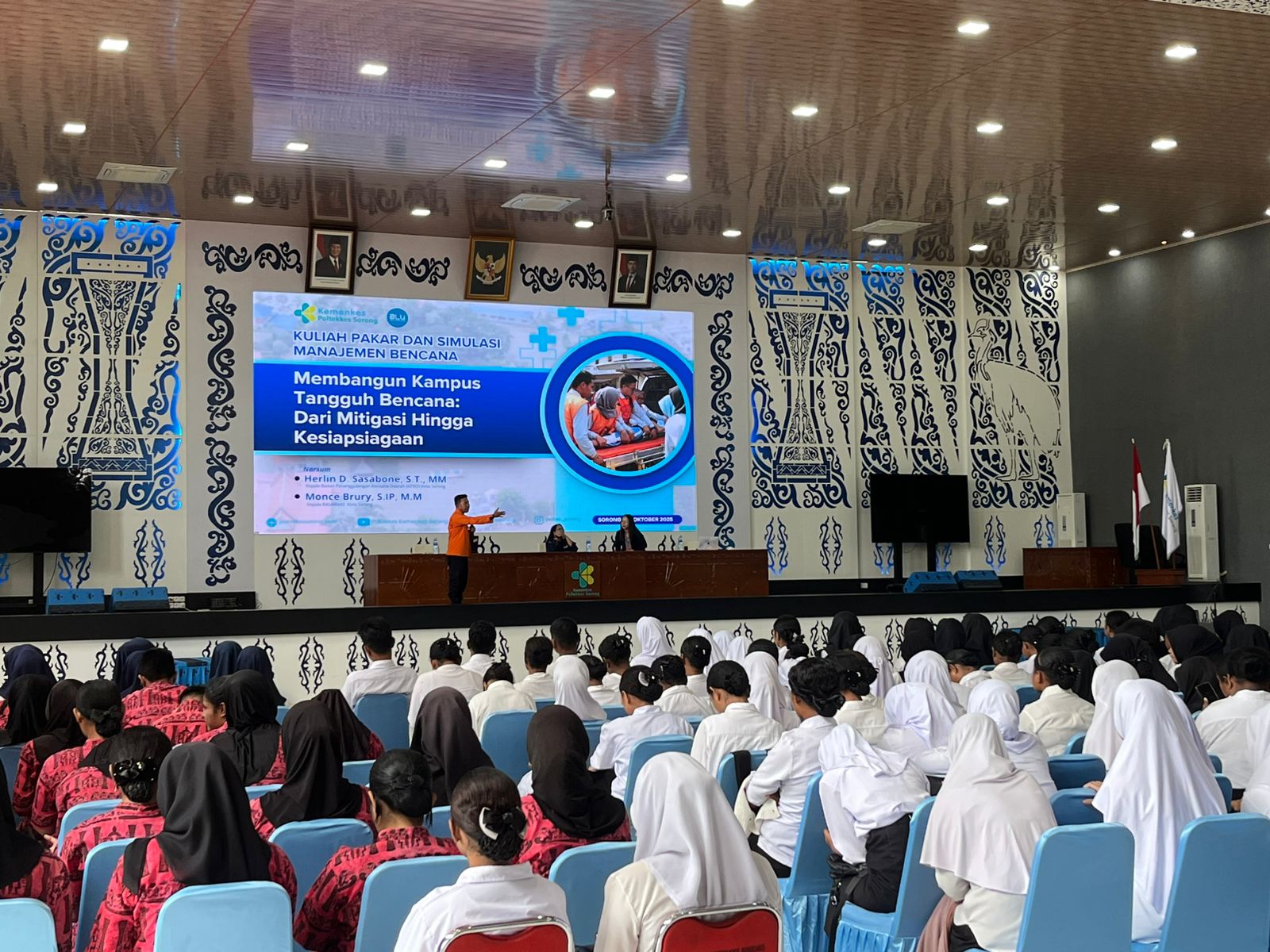 Narasumber dari BPBD, Herlin D Sasabone, menyampaikan bahwa keterlibatan pendidikan tinggi sangat krusial dalam mengurangi dampak bencana melalui transfer ilmu dan simulasi praktis. “Kegiatan ini bertujuan agar mahasiswa memiliki kesiapsiagaan dan pengetahuan teknis ketika menghadapi bencana di lapangan, sehingga mereka dapat berperan aktif dalam tim tanggap darurat bersama BPBD dan Basarnas,” jelas Herlin.