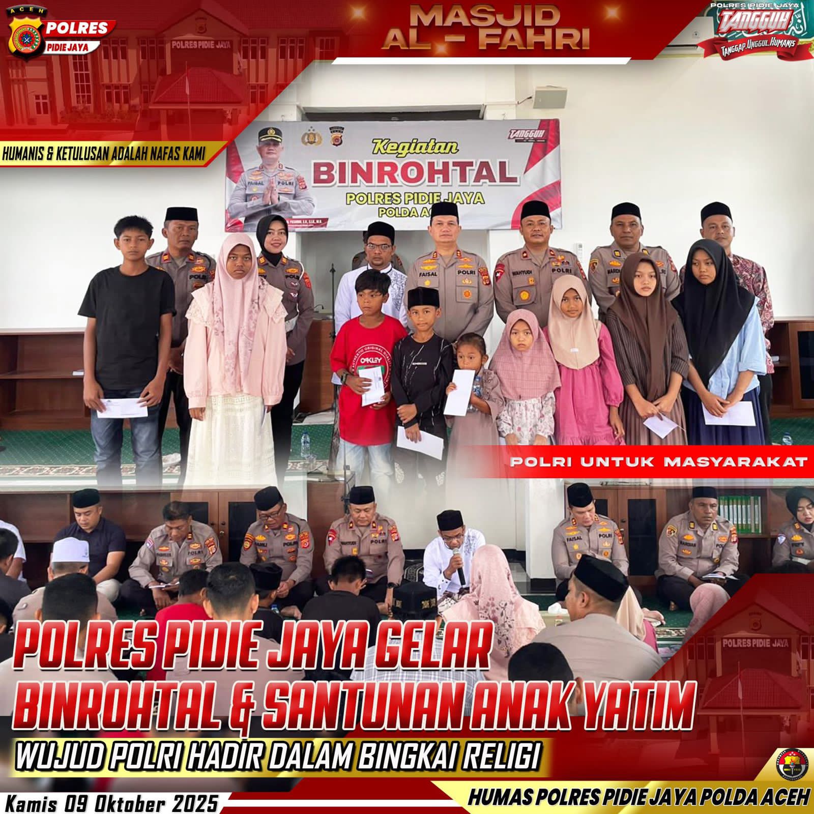 Barometer99.com – Kepala Kepolisian Resor Pidie Jaya AKBP Ahmad Faisal Pasaribu, S.H., S.I.K., M.H. Turut Melaksanakan Kegiatan Binrohtal dan Berikan Santunan Kepada Anak Yatim, bertempat di masjid Al-Fahri (24/9)