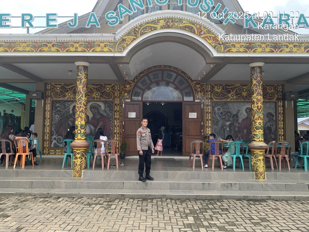 Polres Landak – Polsek Mempawah Hulu, Polda Kalbar, Barometer99.com – Personel Polsek Mempawah Hulu melakukan pengamanan untuk menjaga keamanan dan ketertiban pada saat ibadah misa minggu pagi di Gereja Santo Yusuf Karangan, 12/10/25.