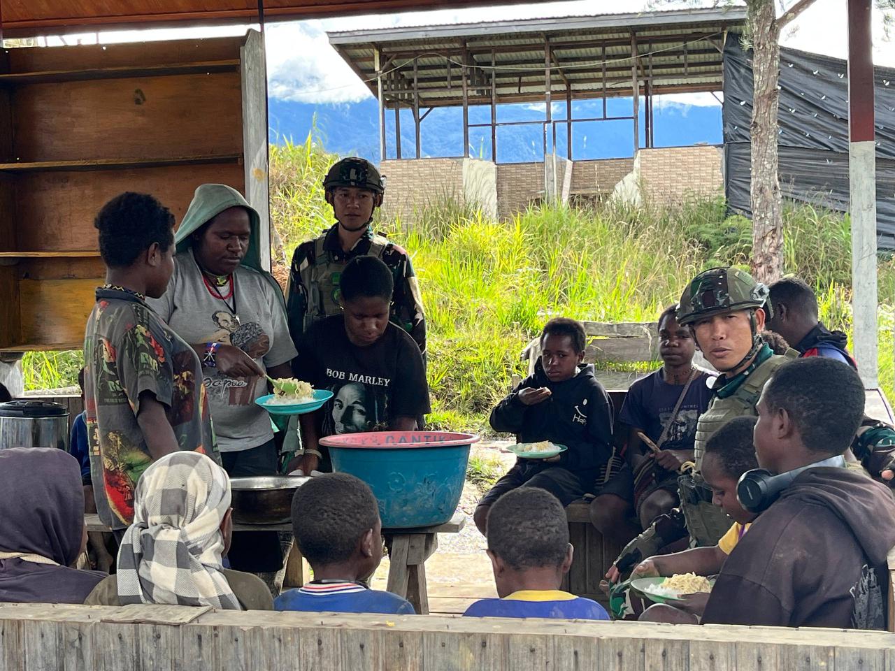 Kegiatan penuh kehangatan ini dipimpin langsung oleh Danpos Eromaga, Letda Inf Sudirman, yang turun langsung berbaur dengan masyarakat. Dengan senyum bersahabat, para prajurit TNI tampak membantu membagikan makanan dan minuman hangat kepada warga yang berkumpul di sebuah pondok sederhana berlatar pegunungan hijau Papua.