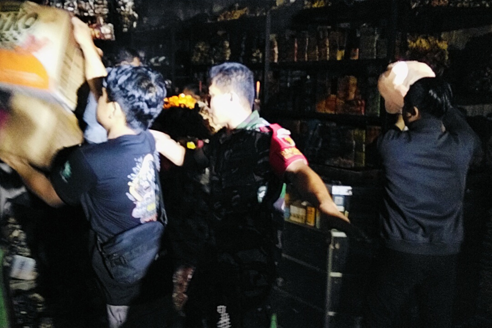 “Kami bersama Damkar dan warga berusaha sekuat tenaga memadamkan api agar tidak merembet ke bangunan lain,” ujar Serka Supriyanto di lokasi kejadian. Ia tampak turut mengangkat karung sembako dan barang dagangan yang masih bisa diselamatkan di tengah asap pekat dan suhu panas.
