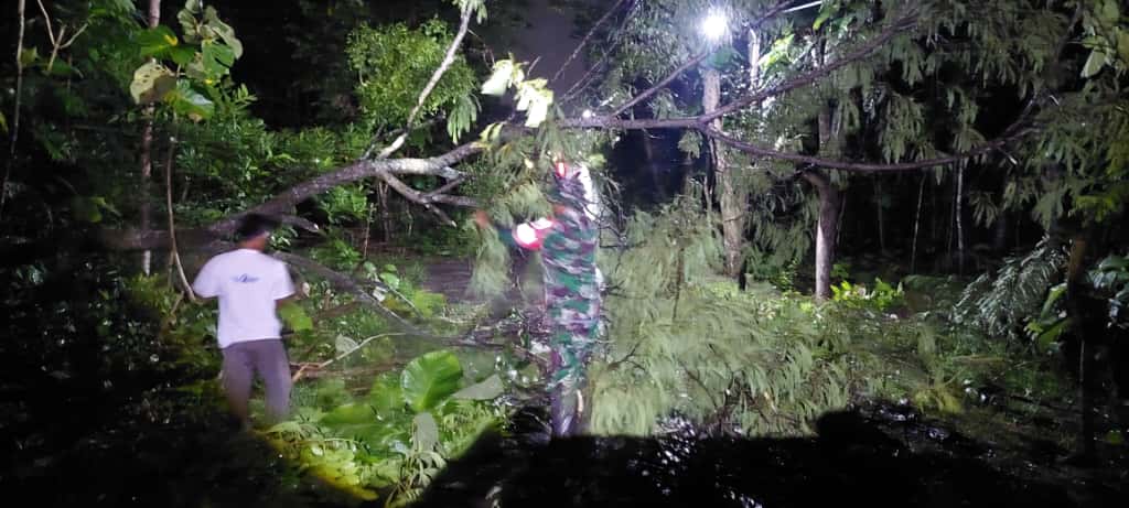 Peristiwa tersebut tak hanya menyebabkan kemacetan, tetapi juga berpotensi membahayakan pengguna jalan yang melintas. Tanpa menunggu lama, Babinsa Sertu Budi Utomo langsung turun ke lokasi untuk berkoordinasi dengan aparat desa dan warga setempat. Dengan sigap mereka bergotong royong menggunakan gergaji dan parang untuk membersihkan ranting serta batang pohon yang menghalangi jalan.