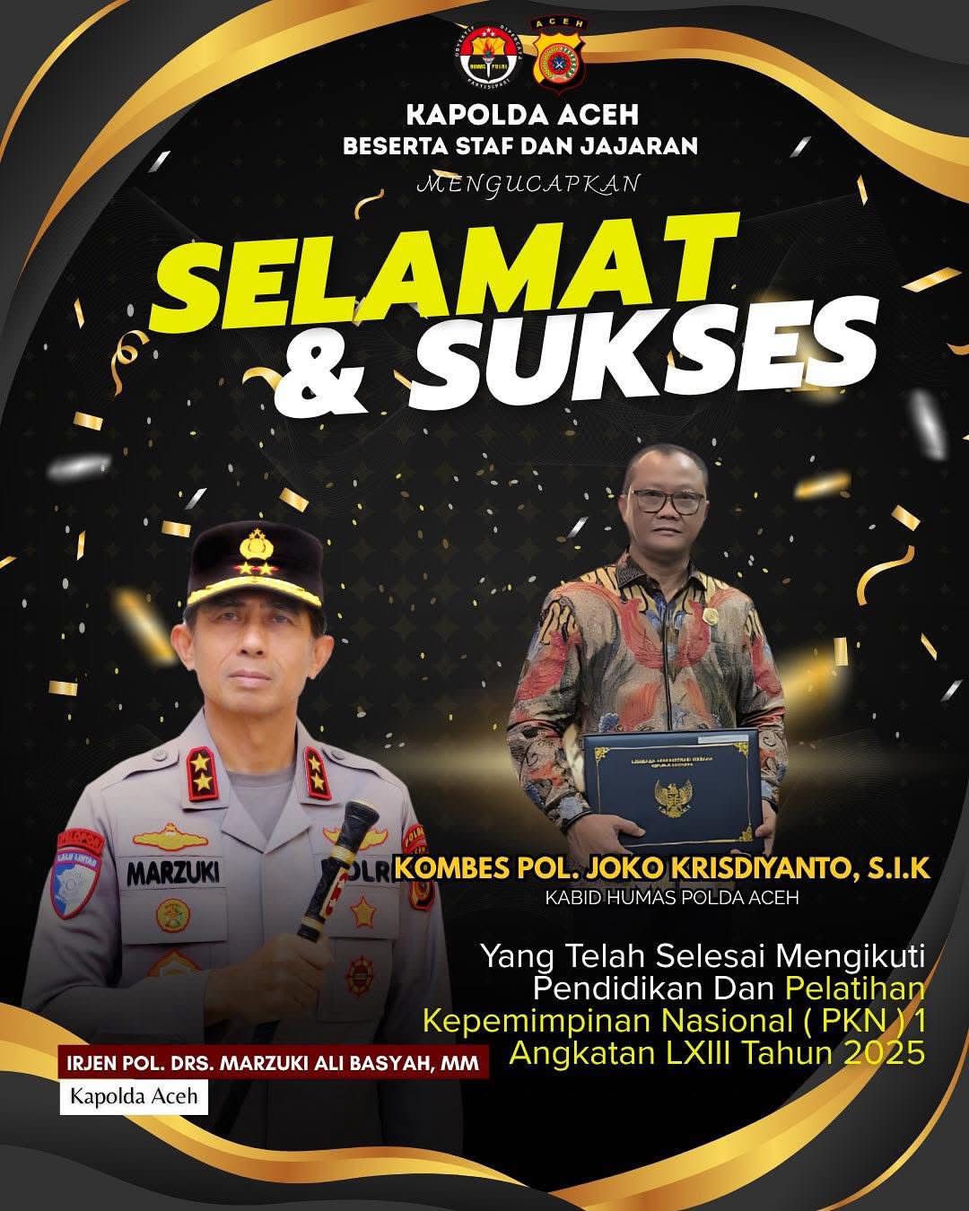 Aceh, Barometer99.com – Kapolda Aceh IRJEN POL. Drs. Marzuki Ali Basyah, M.M Beserta Staf Dan Jajaran Mengucapkan Selamat dan Sukses Kepada Kabid Humas Polda Aceh , KOMBES POL. Joko Krisdiyanto, S.I.K