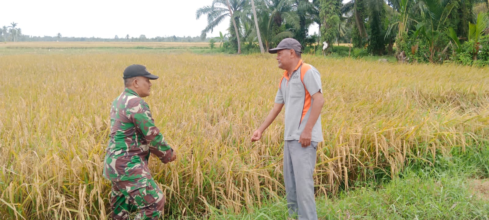 Di lapangan, Babinsa bersama petani melihat secara langsung kondisi padi yang mulai menguning dan siap untuk dipanen. Ia juga memberikan semangat kepada petani agar terus menjaga kondisi lahan hingga waktu panen tiba, sehingga hasil yang diperoleh tetap maksimal.