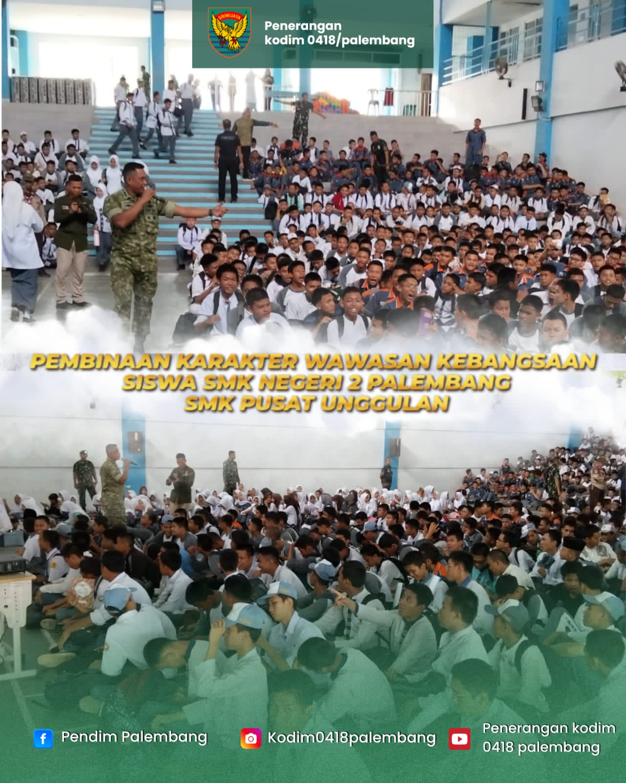 Palembang, Barometer99.com — Komando Distrik Militer (Kodim) 0418/Palembang terus berperan aktif dalam menumbuhkan semangat bela negara di kalangan generasi muda. Hal ini terlihat saat Dandim 0418/Palembang Letkol Arh Erik Novianto, S.Sos, menjadi narasumber dalam kegiatan sosialisasi Persemi yang digelar di SMK Negeri 2 Palembang, Jumat (24/10/2025).