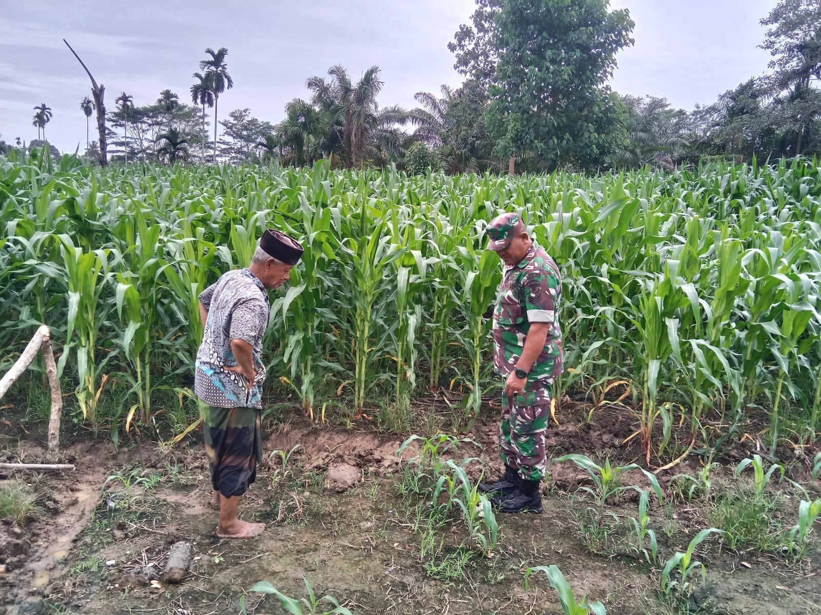 Dalam kegiatan tersebut, Serka Suryadi turun langsung ke lahan pertanian untuk melihat kondisi tanaman jagung sekaligus berdialog dengan para petani mengenai perawatan dan kebutuhan tanaman.