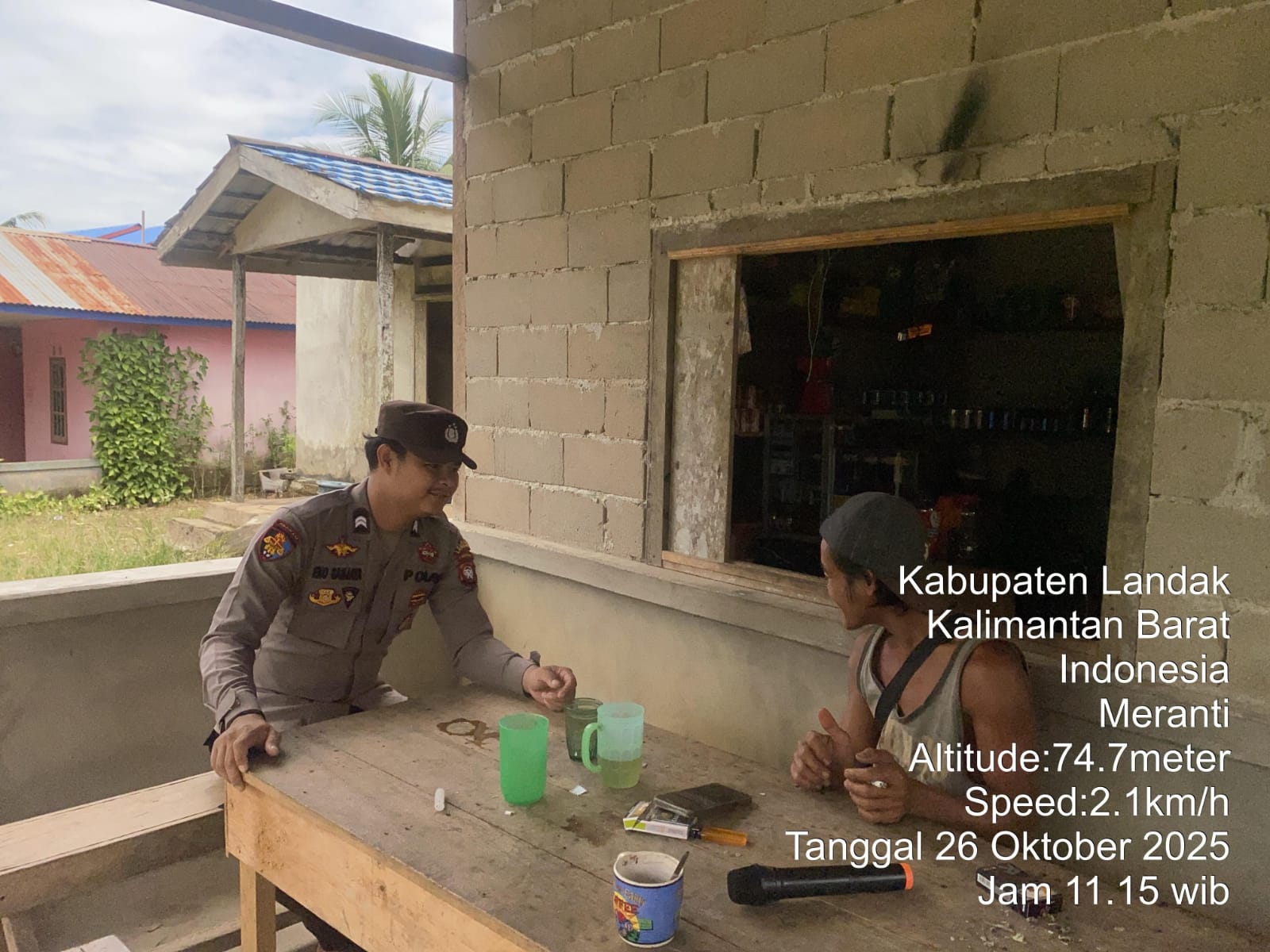 Polsek Meranti ~ Polres Landak ~ Polda Kalbar, Barometer99.com ~ Dalam upaya menciptakan situasi kamtibmas yang aman dan kondusif di wilayah hukumnya, Petugas Polsek Meranti terus aktif menjalin komunikasi langsung dengan masyarakat. Salah satu bentuk nyata kedekatan itu terlihat ketika Polisi melaksanakan kegiatan sambang dan duduk bersama warga di Desa Meranti, Kabupaten Landak, Kalimantan Barat, ” Minggu (26/10/2025)
