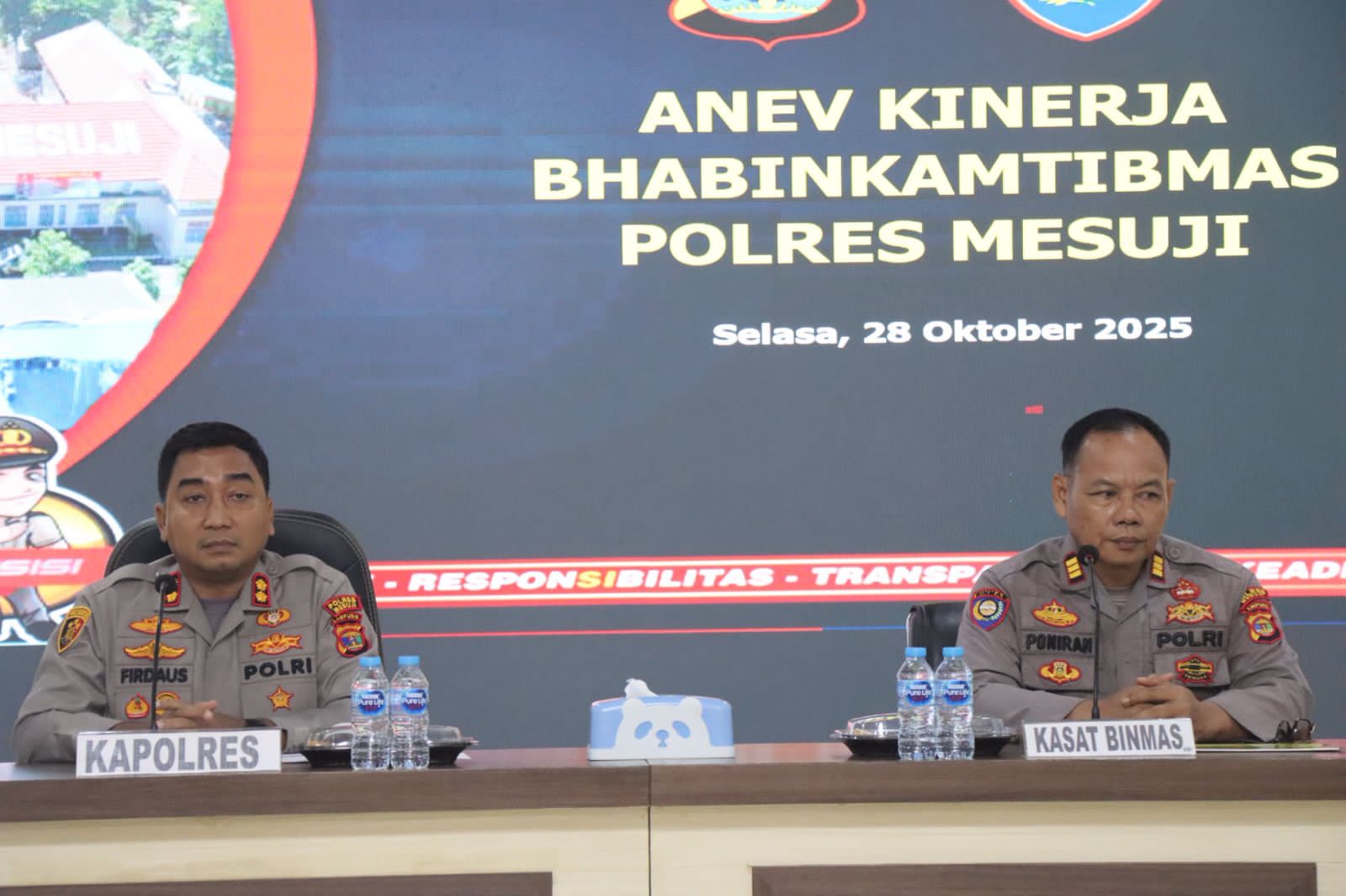 Mesuji, Lampung, Barometer99.com –Polres Mesuji menggelar kegiatan Analisa dan Evaluasi (Anev) kinerja Bhabinkamtibmas jajaran Polres Mesuji. Kegiatan ini dilaksanakan di Aula Tri Brata Endra Dharma Laksana dan dipimpin langsung oleh Kapolres Mesuji AKBP Dr. Muhammad Firdaus S.Ik, M.H. Selasa (28/10/2025)