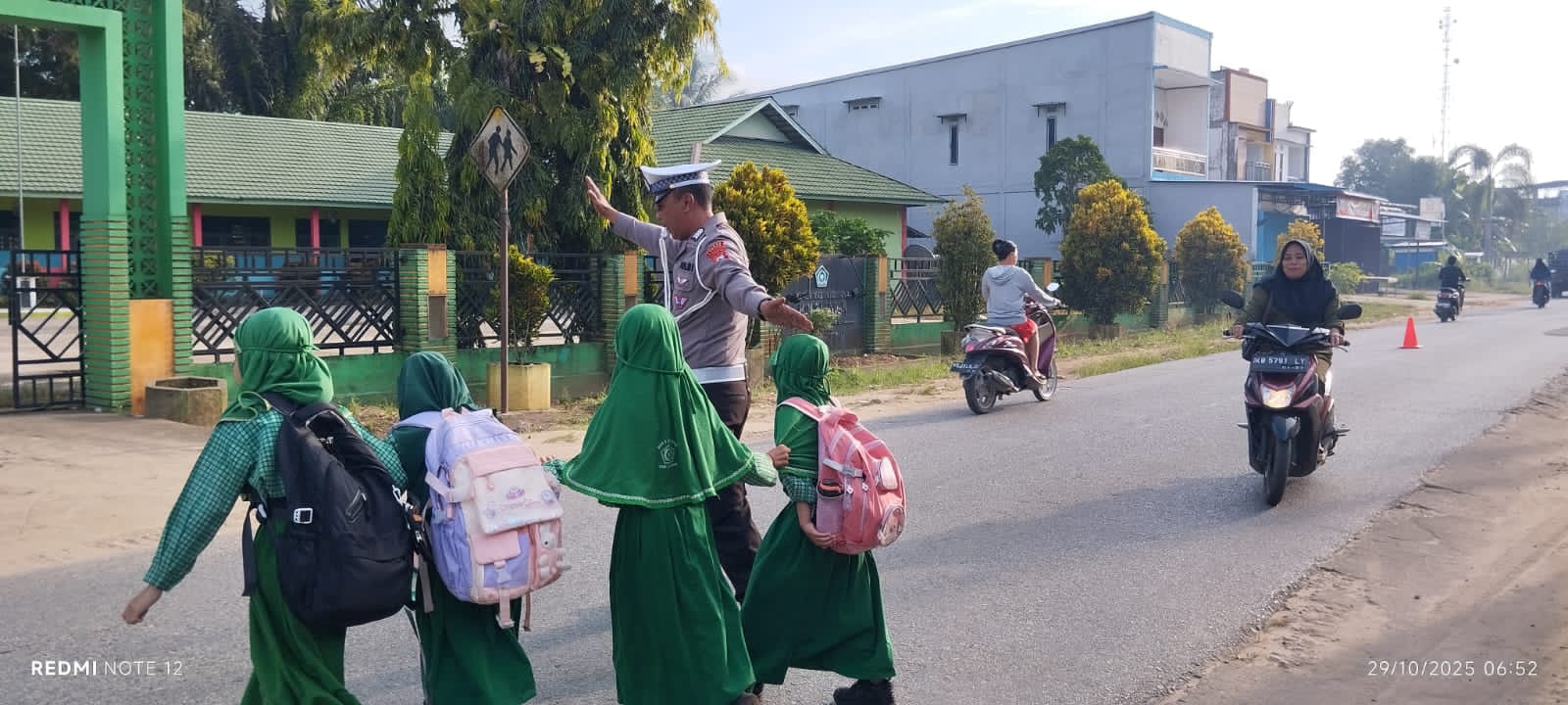 Barometer99.com – Polres Landak Polsek Mempawah Hulu Polda Kalbar melaksanakan kegiatan rutin pengaturan arus lalu lintas dilingkungan sekolah, rabu (29/10/25.)