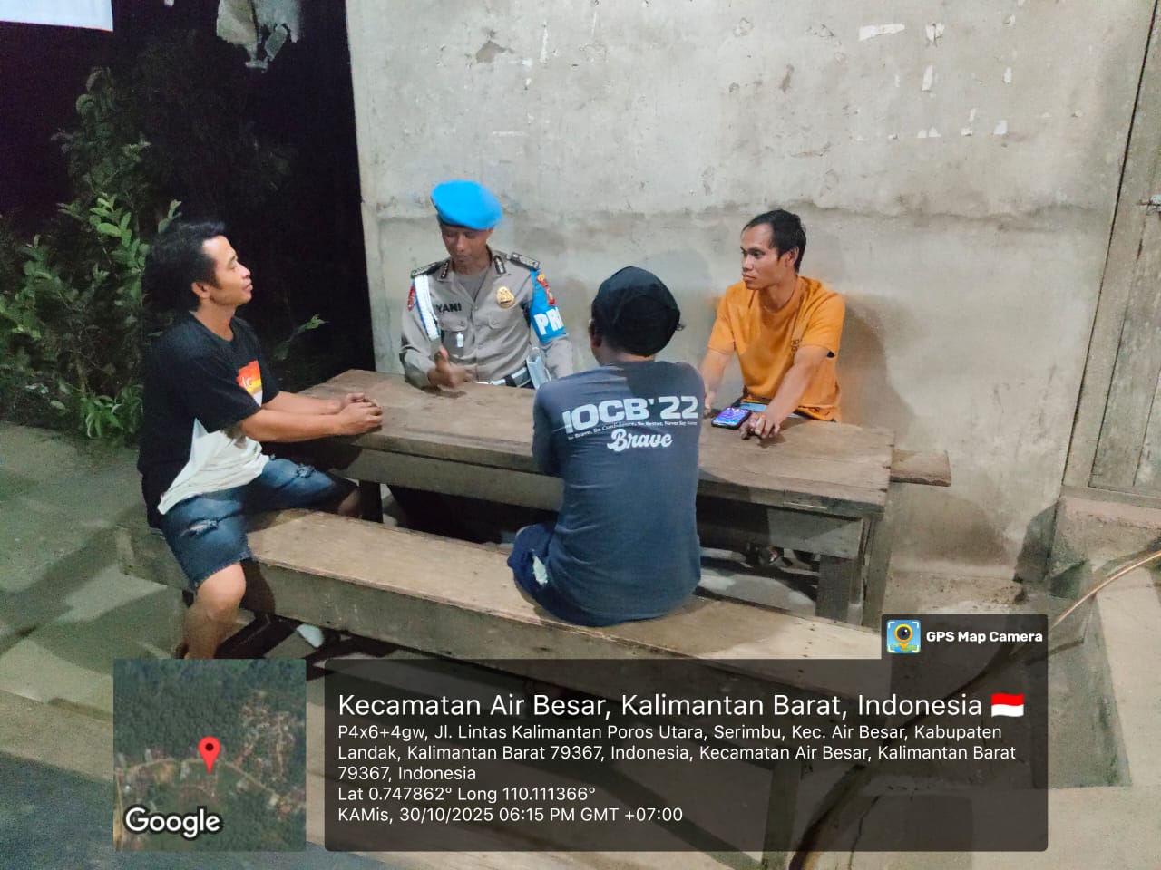Polsek Air Besar ~ Polres Landak ~ Polda Kalbar, Barometer99.com ~ Suasana malam di kawasan Kecamatan Air Besar tampak tenang. Di bawah temaram lampu jalan, beberapa warga terlihat duduk santai di pinggir jalan, menikmati udara malam. Namun ketenangan itu semakin terasa aman ketika petugas patroli dari Polsek Air Besar datang menyapa mereka dengan ramah, ” Kamis (30/10/2025)