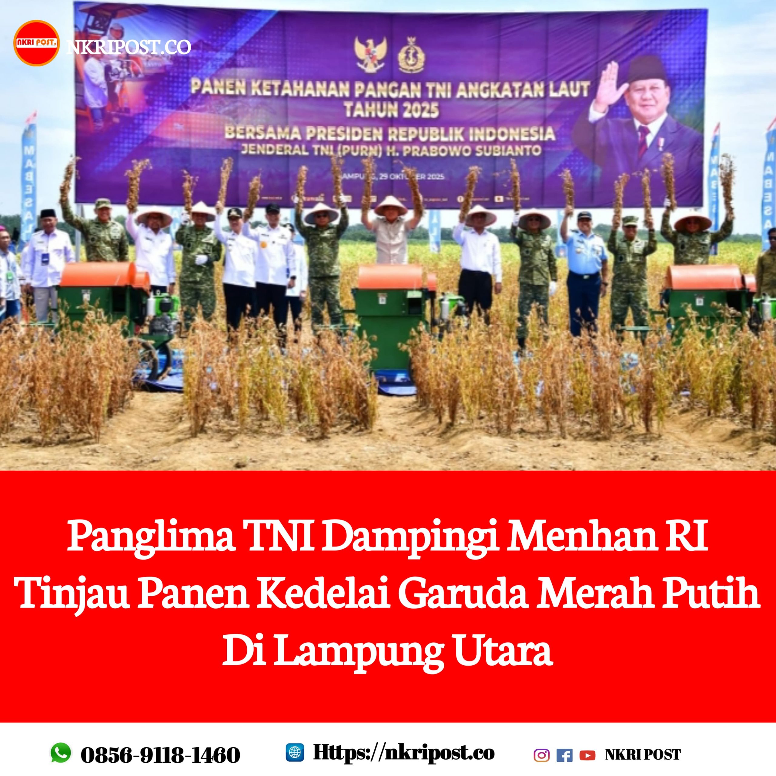 Lampung, Barometer99.com – Panglima TNI Jenderal TNI Agus Subiyanto bersama Kepala Staf TNI Angkatan Laut Laksamana TNI Muhammad Ali mendampingi Menteri Pertahanan Republik Indonesia Sjafrie Sjamsoeddin meninjau langsung hasil panen kedelai di lahan pertanian Komplek Pemukiman TNI AL (Kimal), Desa Madukoro, Kotabumi, Lampung Utara, Lampung, Rabu (29/10/2025).