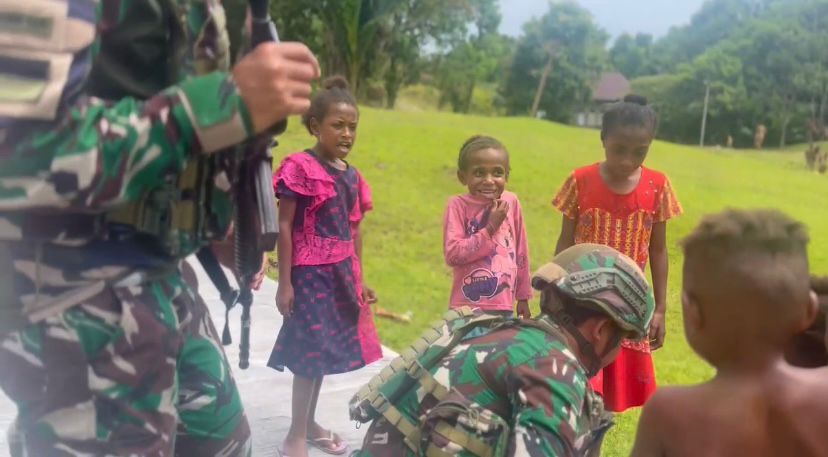 Maybrat, Barometer99.com – Satgas Pamtas RI-PNG Kewilayahan Yonif 763/SBA Pos Afkrem bersama masyarakat melaksanakan kegiatan Pembinaan Teritorial dengan cara Berbagi Sendal untuk anak-anak Kampung Afkrem, Distrik Aifat Selatan, Kabupaten Maybrat, Provinsi Papua Barat Daya (3/11/2025).