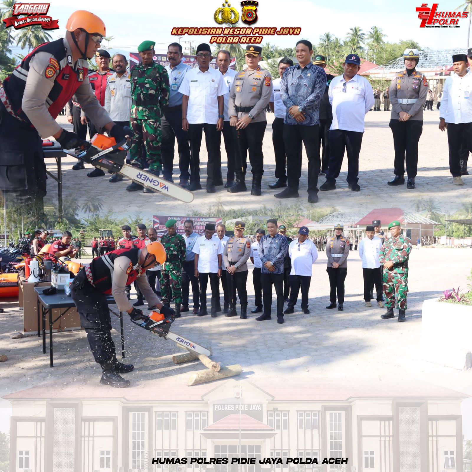 Usai apel, Kapolres Pidie Jaya bersama unsur Forkopimda meninjau kesiapan pasukan dan menyaksikan simulasi tanggap bencana yang diperagakan oleh personel Polres Pidie Jaya bersama unsur TNI, BPBD, Tagana, dan Basarnas.