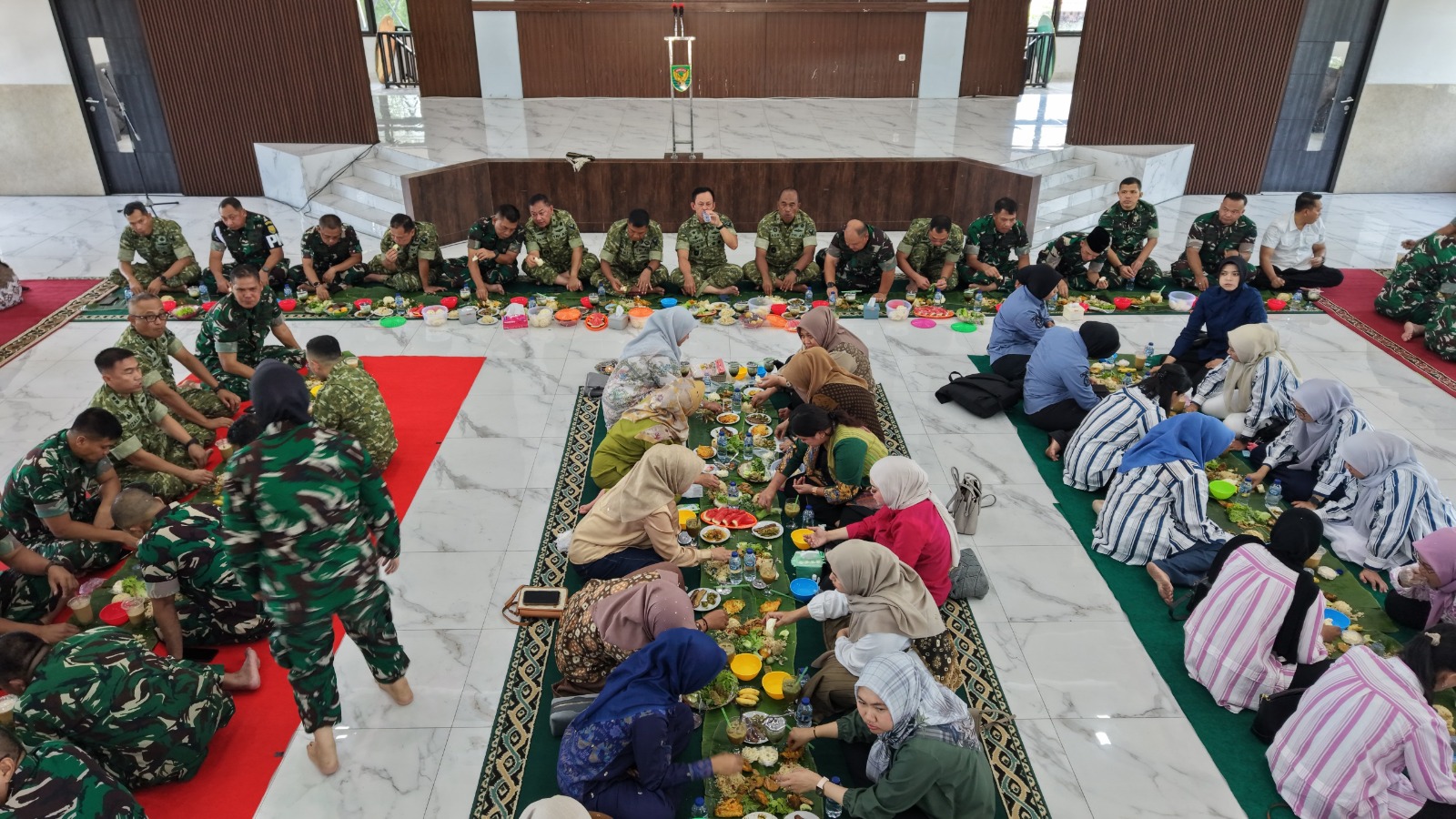 Hidangan sederhana namun sarat makna kebersamaan tersaji di atas daun pisang, seperti nasi liwet, ikan asin, ayam goreng, tahu, tempe, sambal, serta aneka lalapan segar. Semua duduk bersama, sama rendah, sama rasa, menciptakan suasana hangat yang mencerminkan nilai kekeluargaan dan kebersamaan di lingkungan Korem 044/Gapo.