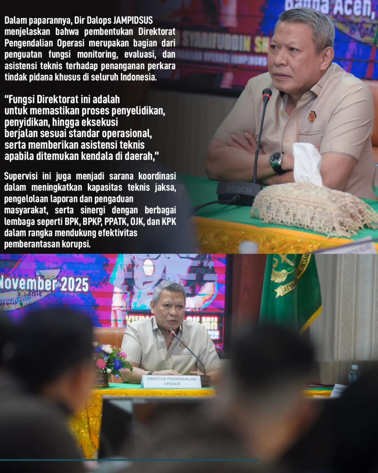 “Fungsi Direktorat ini adalah untuk memastikan proses penyelidikan, penyidikan, hingga eksekusi berjalan sesuai standar operasional, serta memberikan asistensi teknis apabila ditemukan kendala di daerah,” ujar Muhammad Syarifuddin.