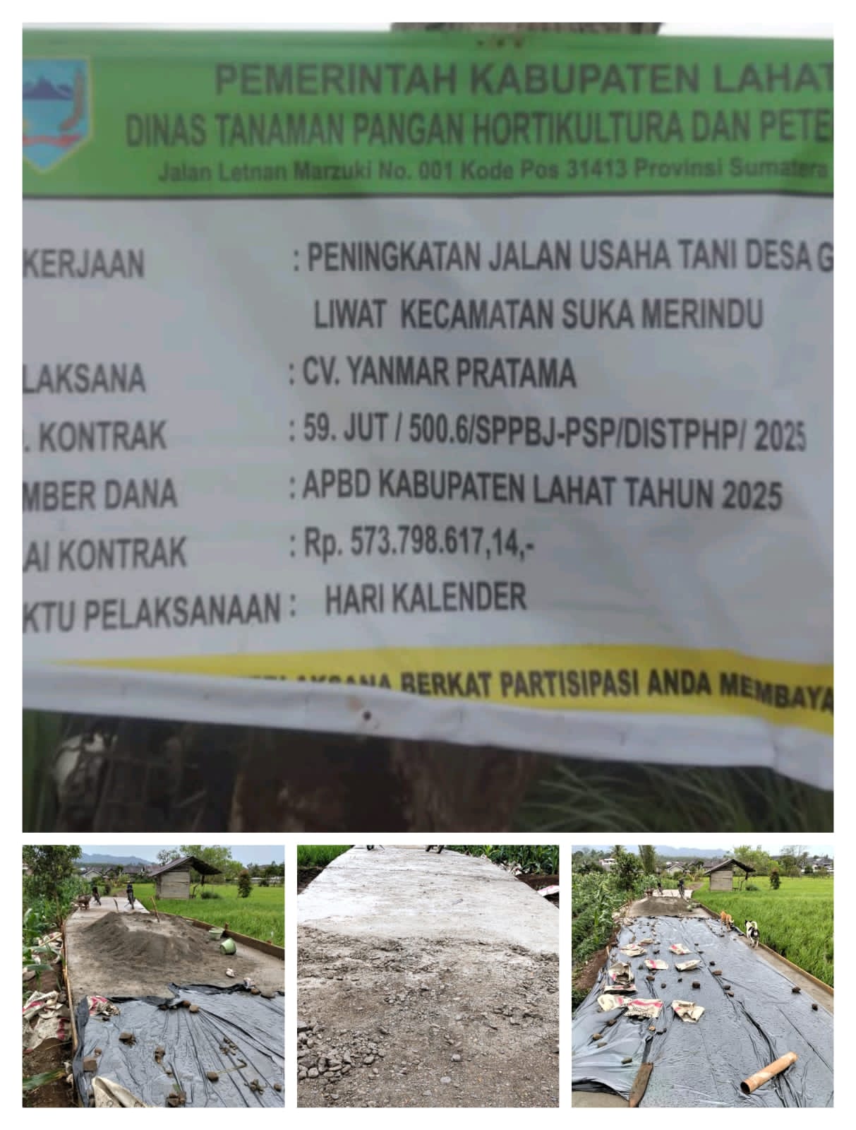 Diketahui Proyek pembangunan peningkatan usaha tani dikerjakan oleh CV Yanmar Pratama dengan pagu anggaran RP. 573.798 617.14. (Lima Ratus Juta tujuh Puluh tiga tujuh ratus sembilan puluh delapan Rupiah) Anggaran APBD Kabupaten Lahat Tahun 2025 jadi keluhan dan sorotan masyarakat.