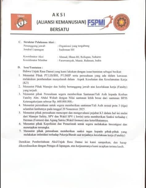 Keempat menuntut perusahaan untuk segera memberikan santunan tali asih sesuai poin 3 selambat-lambatnya pada tanggal 20 November 2025. Kelima menuntut pihak perusahaan mencopot dan mengevaluasi pejabat K3 dalam hal ini mulai dari Manajer safety, SPV dan Wakil SPV (iswin) serta memberikan sanksi terhadap Herman selaku Formen dan Agus Satria wakil forman atas keterlibatannya.