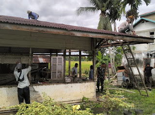 Babahrot, Barometer99.com – Babinsa Koramil 07/Babahrot Kodim 0110/Abdya Koptu Sopiyan bersama para petani Poktan Mekar Jaya melaksanakan gotong royong merehabilitasi balai pertemuan tani di persawahan Desa Alue Dawah Kecamatan Babahrot, Sabtu (15/11/2025).