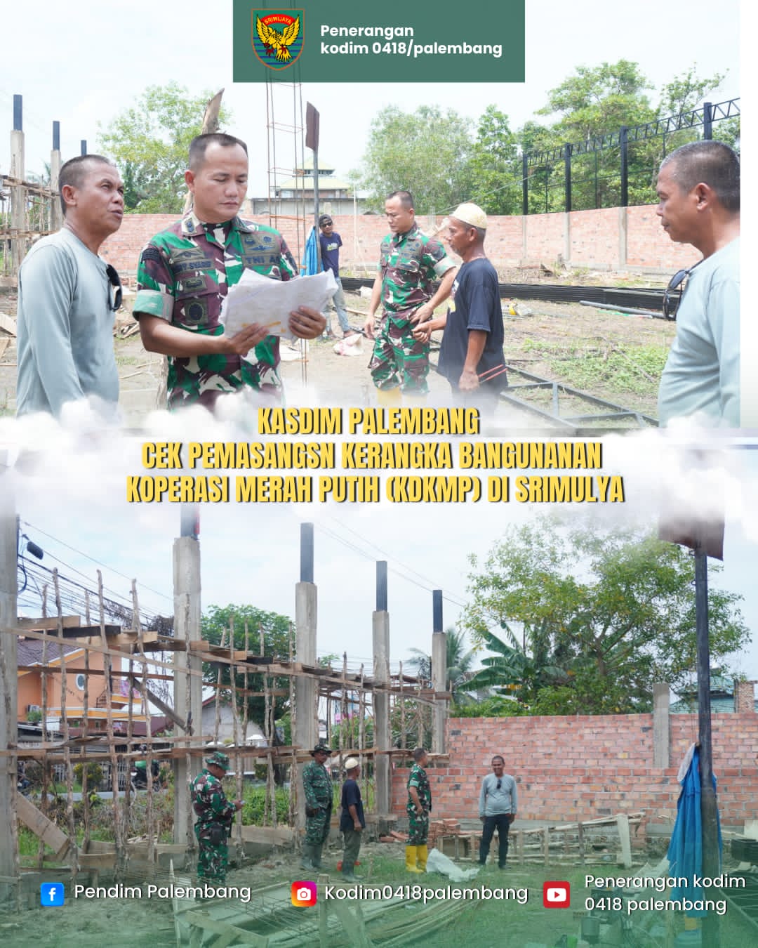 Palembang, Barometer 99.com — Kasdim 0418/Palembang Letkol Inf Dery Septriandi, S.T., M.M., M.Han meninjau langsung progres pemasangan kerangka bangunan Koperasi Desa Kelurahan Merah Putih (KDKMP) yang berlokasi di Srimulya, Selasa (2/12/2025).