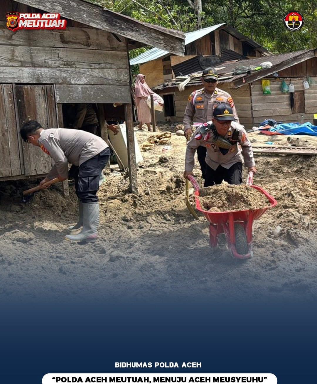 Dengan peralatan seadanya, personel kepolisian bersama warga membersihkan lumpur, sampah, serta sisa material banjir yang masih menumpuk di dalam dan sekitar rumah warga. Kegiatan ini dilakukan untuk membantu mempercepat pemulihan lingkungan dan memungkinkan warga kembali menempati rumah mereka dengan lebih layak.