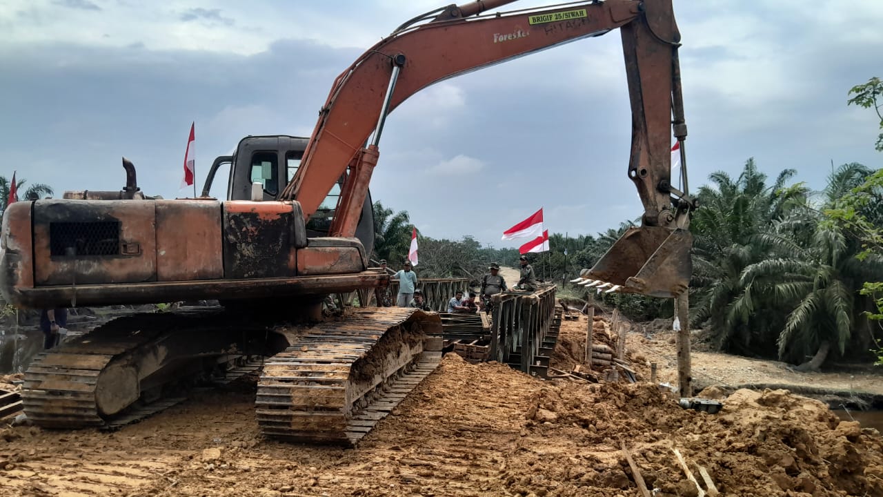 Teriknya matahari tidak menggoyang semangat para prajurit di lapangan dalam merakit rangka baja jembatan yang menjadi akses vital penghubung Desa Buket Dara Baro dengan Desa Cinta Makmur setelah jembatan sebelumnya terputus total diterjang arus banjir.