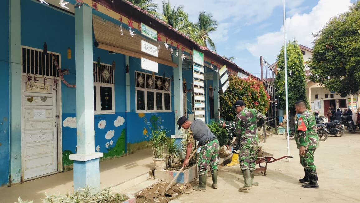 Selain membersihkan lumpur, anggota Koramil juga membantu menyingkirkan material banjir yang menghambat akses siswa, serta memperbaiki beberapa bagian yang mengalami kerusakan ringan akibat tingginya debit air.