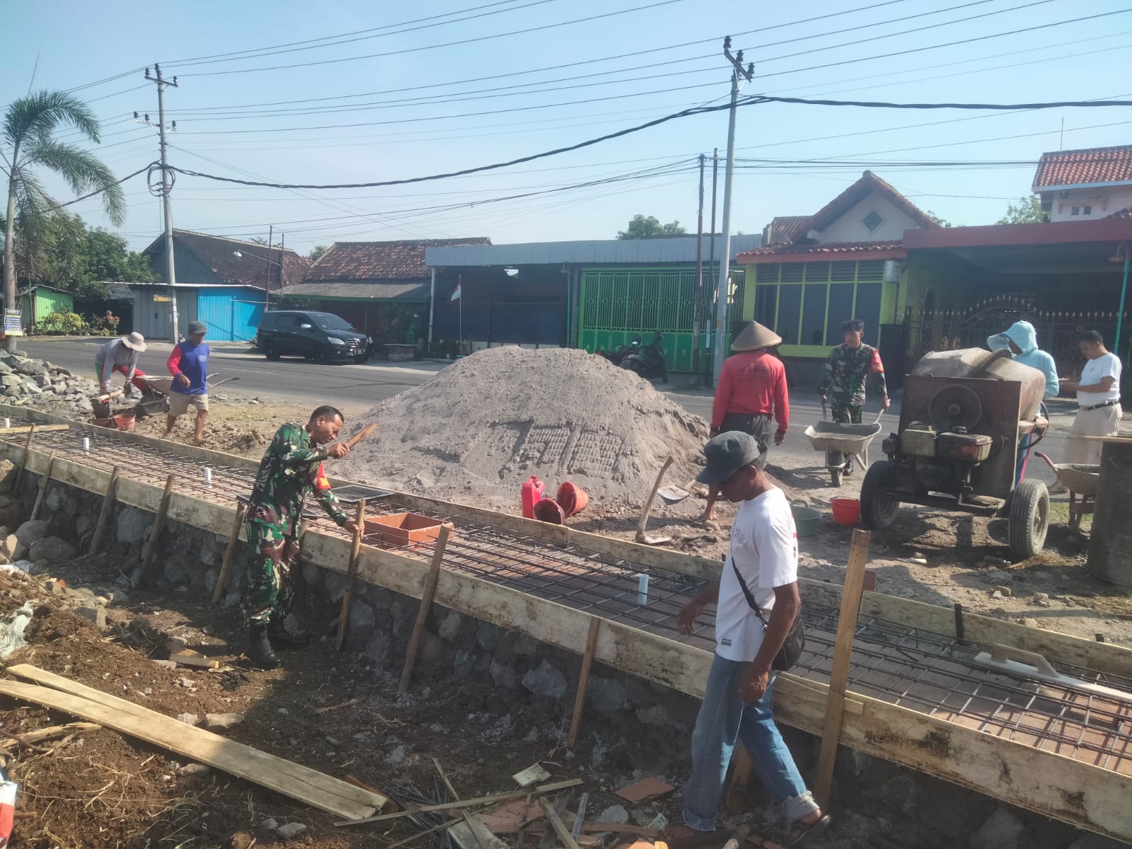 Barometer99.com – Sragen, Pelda R. Jumarno berserta dua Anggota Koramil 18/Kalijambe Kodim 0725/Sragen bersama warga membuat talud penahan jalan di Dusun Plosorejo RT.12 Desa Kalimacan Kecamatan Kalijambe, Senin (08/12/2025).