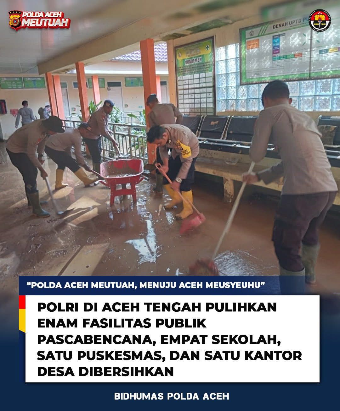Di Kecamatan Rusip Antara, personel BKO Brimob Polda Aceh bersama personel Polsubsektor Rusip Antara Polsek Silih Nara melaksanakan gotong royong pembersihan UPTD Puskesmas Rusip Antara yang tertimbun lumpur. Puluhan personel gabungan dikerahkan untuk mempercepat pemulihan fasilitas pelayanan kesehatan agar dapat segera beroperasi secara optimal melayani masyarakat.
