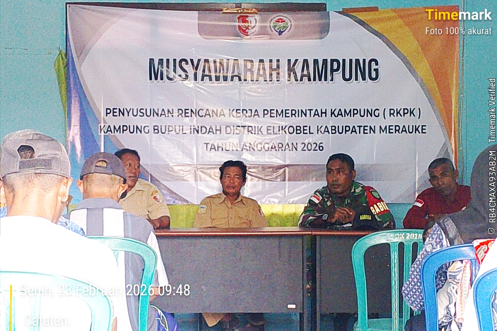 Kegiatan berlangsung di Balai Kampung Bupul Indah, Distrik Elikobel, Merauke, Papua Selatan, dengan suasana penuh kekeluargaan. Sejumlah tokoh hadir, di antaranya Jasmin selaku Kepala Kampung Bupul Indah, Fakudin, Ketua Bamuskam La Wan, Pendamping Distrik Alexander M. Raya, P3MD PLD Siti Komanah, Kaur Perencanaan Rohim, serta Danton Linmas Yunus. Musyawarah juga diikuti para ketua RW/RT dan masyarakat setempat, Senin (23/2/26).