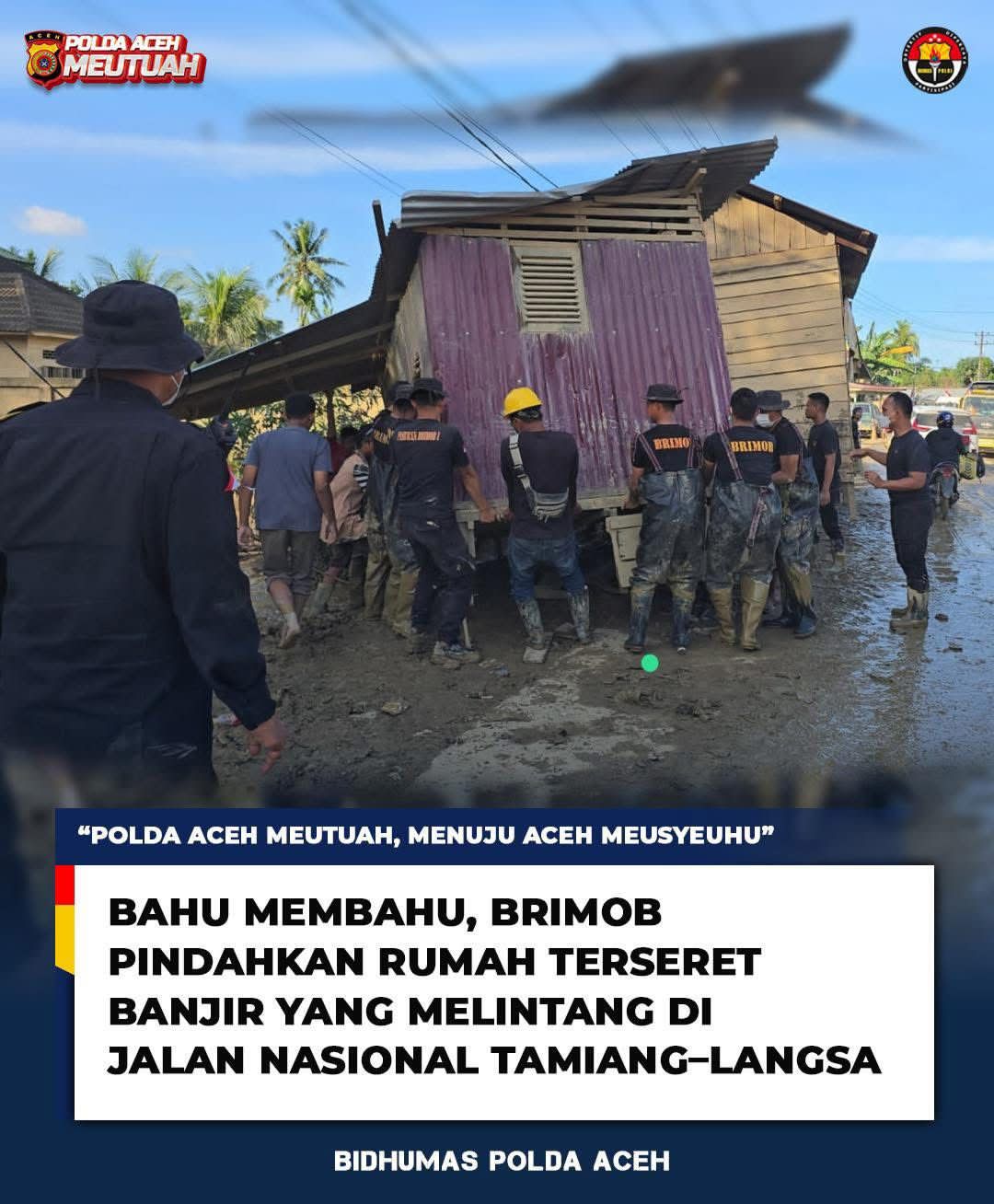 Rumah tersebut diketahui terbawa arus deras banjir dari kawasan permukiman dan tersangkut di tengah jalan, menutup jalur utama yang menghubungkan Aceh Tamiang dan Kota Langsa. Agar arus lalu lintas lancar, personel Brimob bersama masyarakat bekerja bahu-membahu mengevakuasi struktur rumah ke lokasi aman di pinggir jalan.