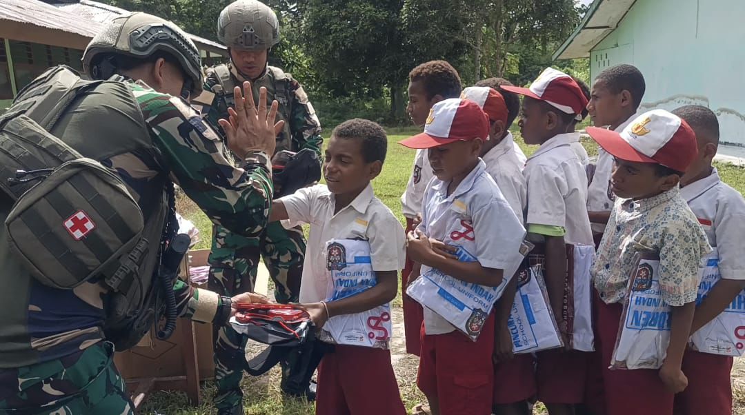 KEEROM, Barometer99.com – Personil Satgas Yonif 643/Wns Pos Kotis, Pos Wembi, Pos Waris dan Pos Kaliasin melaksanakan kegiatan pembagian seragam sekolah, tas, alat tulis kantor (ATK) dan pensil warna kepada siswa-siswi Sekolah Dasar (SD) di wilayah binaan sebagai bentuk kepedulian terhadap dunia pendidikan, Kab. Keerom, Prov. Papua, Rabu (28/1/2026).