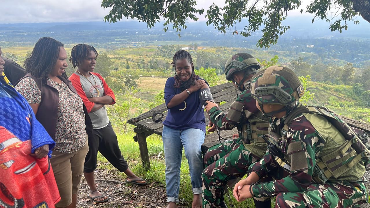 Setibanya di lokasi, rombongan disambut hangat oleh Bapak David beserta keluarga, Perbincangan berlangsung santai membahas situasi keamanan kampung, aspirasi warga, dan harapan masyarakat Papua, Di sela-sela dialog, personel kesehatan dari pos melakukan pemeriksaan kesehatan ringan kepada Bapak David dan keluarga, termasuk pengecekan tekanan darah dan kondisi tubuh secara umum.