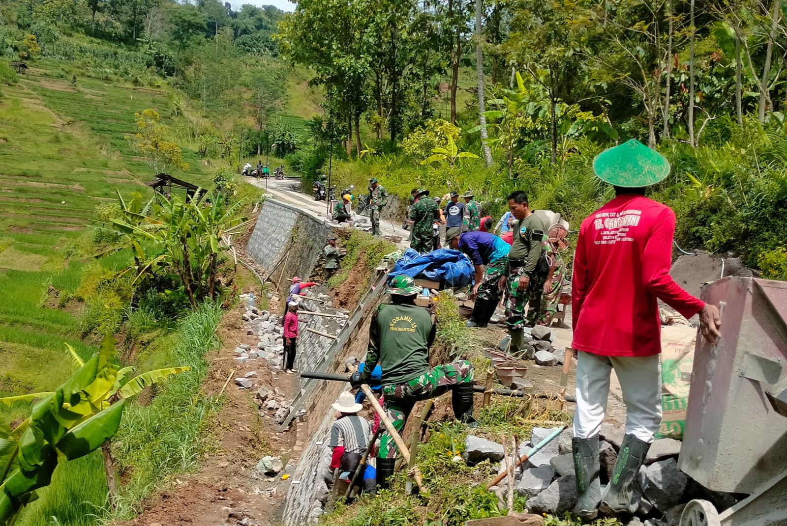 Di sana, acap terlihat Prajurit TNI sedang bekerja membuat talud badan jalan, atau membangun jalan di pelosok desa.