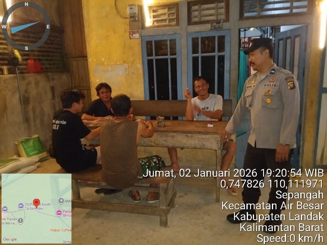 Pada Jumat malam (2/1/2026), personel Polsek Air Besar melaksanakan patroli malam dialogis di sejumlah titik keramaian warga, mulai dari warung kopi hingga pemukiman masyarakat di wilayah Desa Serimbu dan Sepangah, Kecamatan Air Besar, Kabupaten Landak.