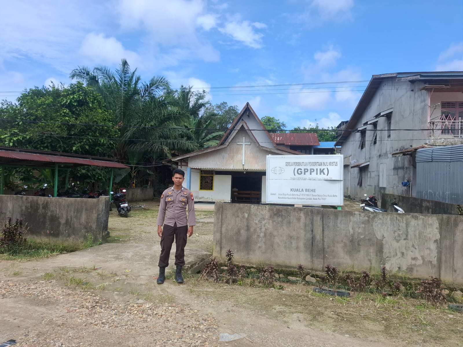 Polsek Kuala Behe – Polres Landak – Polda Kalbar, Barometer99.com – Demi menciptakan situasi yang aman dan kondusif warga melaksanakan ibadah minggu Anggota piket Polsek Kuala Behe Aipda Roni Riansyah bersama Brigpol Goliat Fran Alipa melaksanakan pengamanan yang merupakan kegiatan rutin dilaksanakan setiap hari minggu di Kecamatan Kuala Behe, Minggu (22/02/2026).