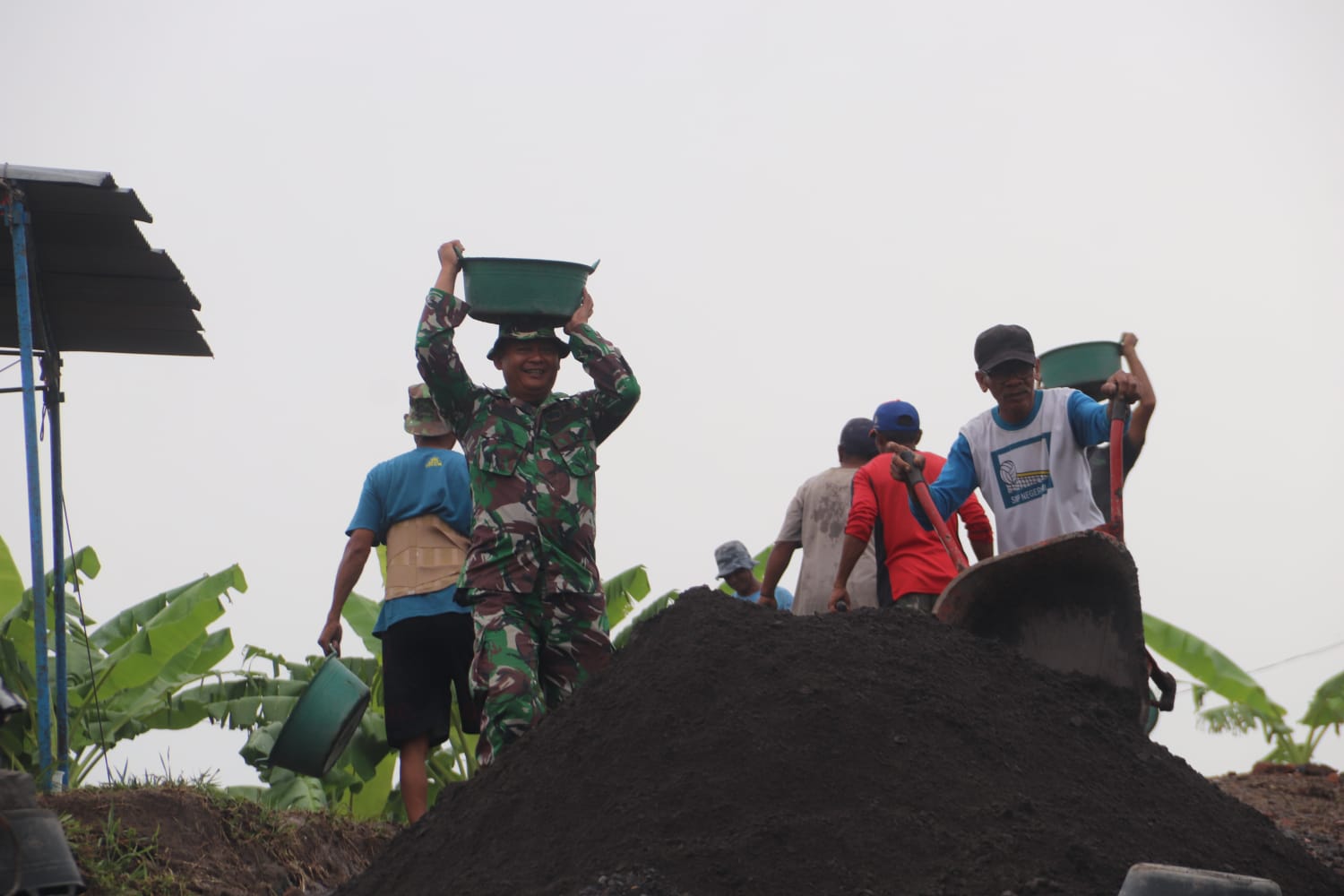 Pekerjaan yang dilakukan oleh Tim pelaksana konstruksi Kodim 0732/Sleman Walaupun kondisi cuaca hari ini mendung bercampur sedikit gerimis akan tetapi pekerja tetap melaksanakan pekerjaan tersebut dengan semangat.