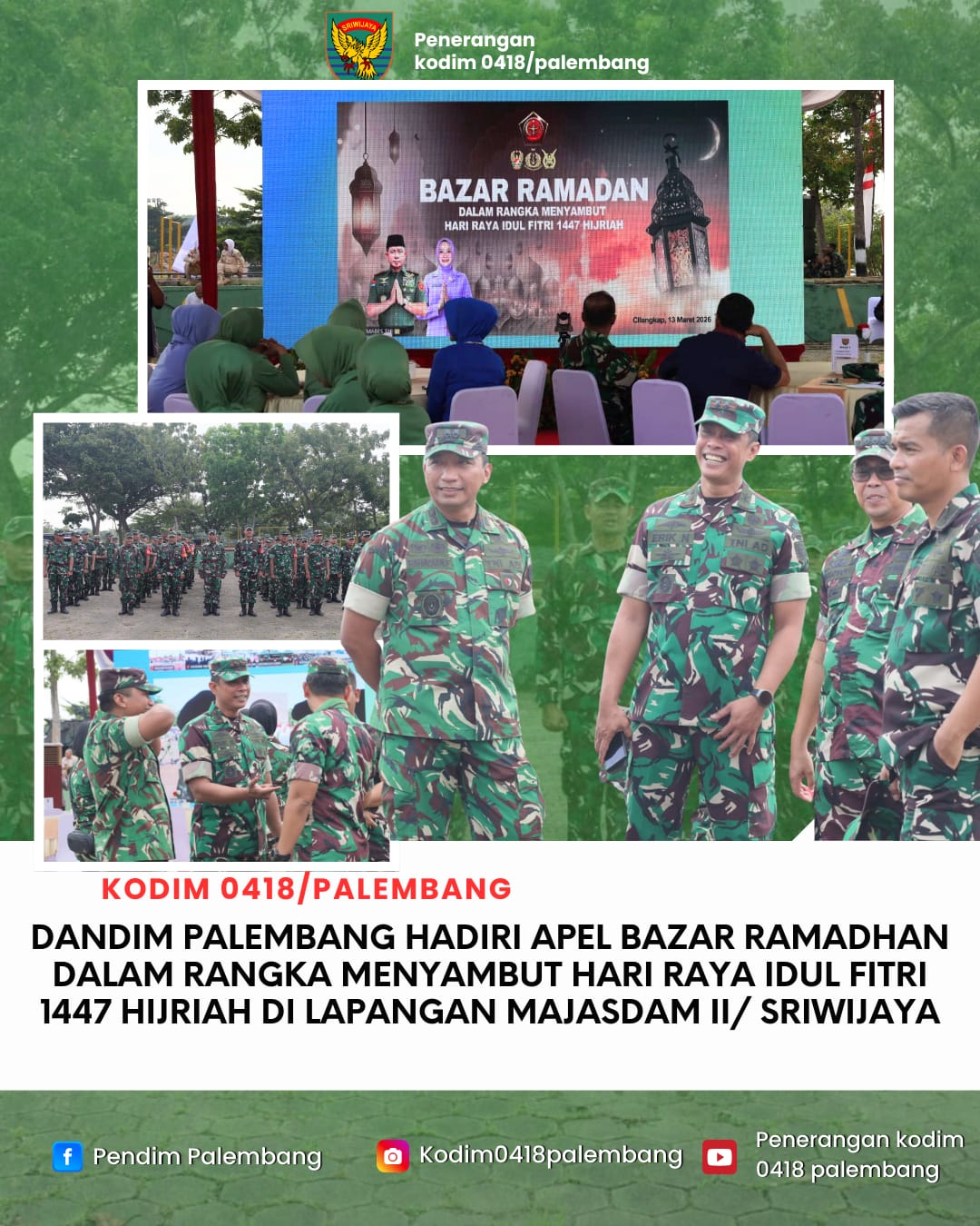 PALEMBANG, Barometer99.com — Komandan Kodim 0418/Palembang, Letkol Arh Erik Novianto,S.Sos , menghadiri apel pembukaan Bazar Ramadan dalam rangka menyambut Hari Raya Idul Fitri 1447 Hijriah yang digelar di Lapangan Majasdam II/Sriwijaya, Kota Palembang.