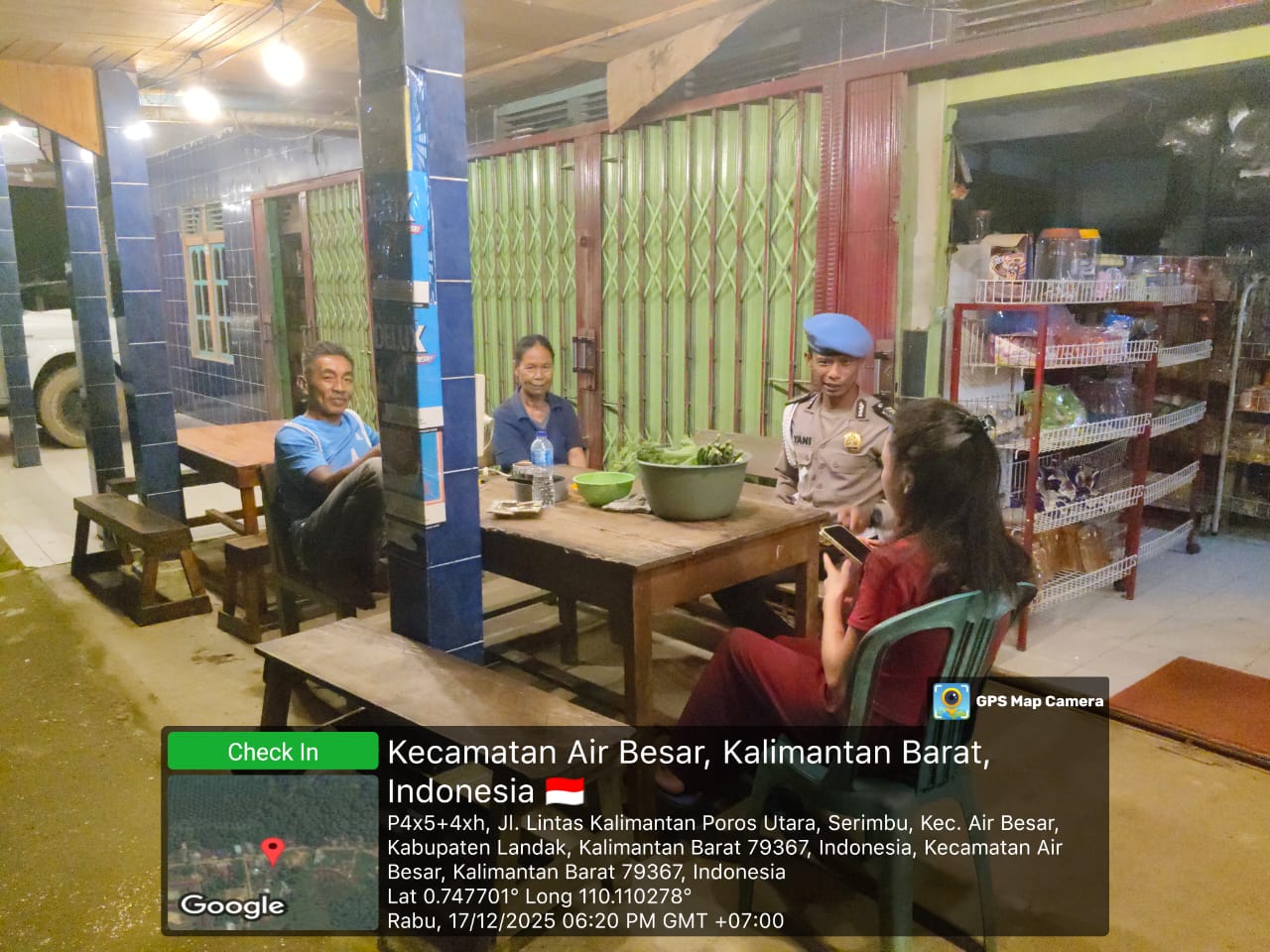 Polsek Air Besar ~ Polres Landak ~ Polda Kalbar, Barometer99.com ~ Di bawah sinar rembulan yang menerangi malam, suasana Kecamatan Air Besar tampak tenang dan penuh keakraban. Pada Rabu (17/12/2025), jajaran Kepolisian Sektor Air Besar melaksanakan patroli malam sembari menyapa dan berdialog langsung dengan warga yang masih beraktivitas.