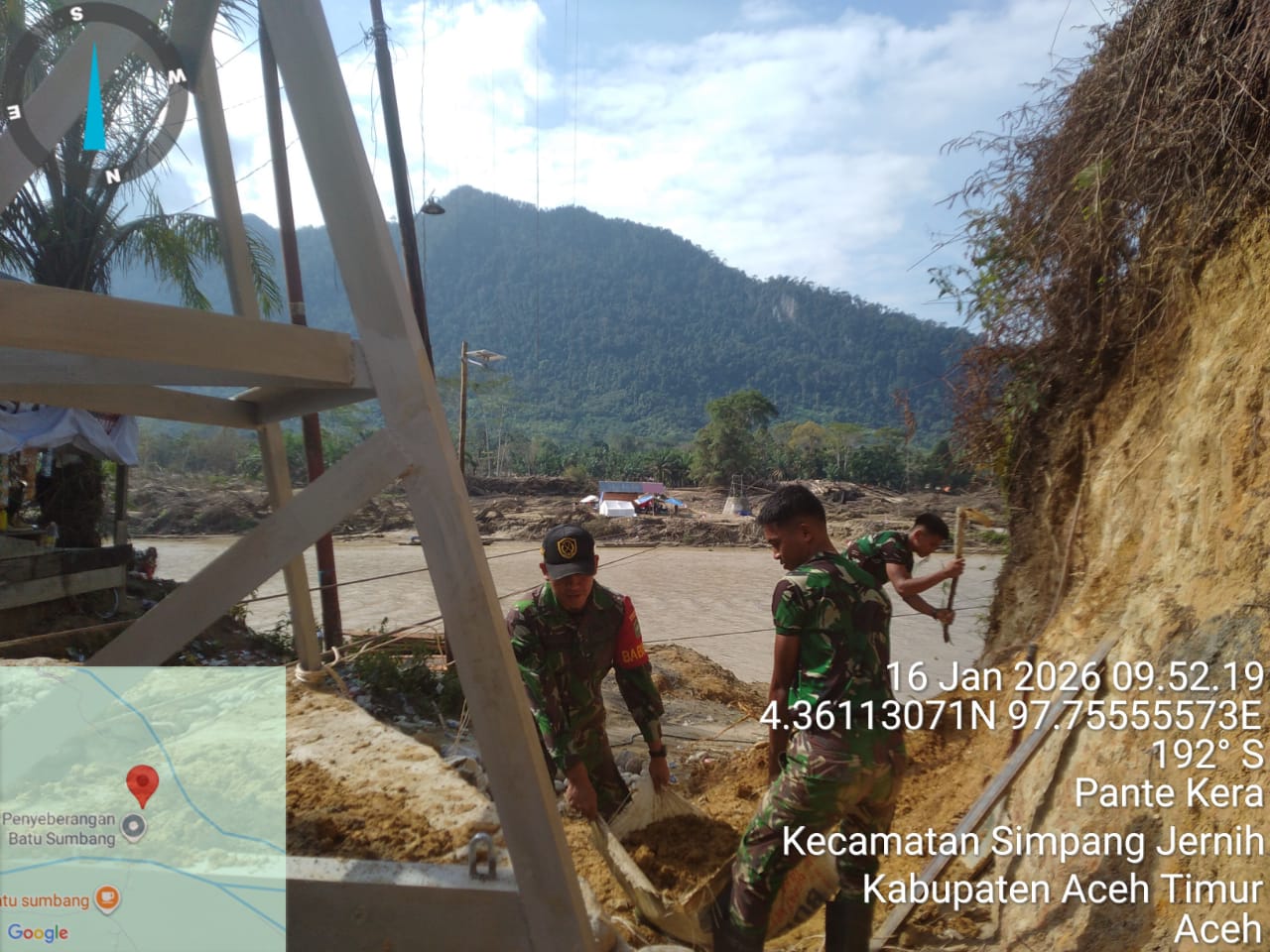 Aceh Timur, Barometer99.com – Di bawah terik matahari pagi, semangat kebersamaan terlihat jelas di Desa Pante Kera, Kecamatan Simpang Jernih, Kabupaten Aceh Timur. Pada 16 Januari 2026, Sertu Taufiq, Babinsa Koramil 10/Simpang Jernih Kodim 0104/Aceh Timur, bersama personel Yon TP 853/BRB melaksanakan kegiatan penggalian tanah untuk penimbunan menara Deadmen “B” Jembatan Gantung.