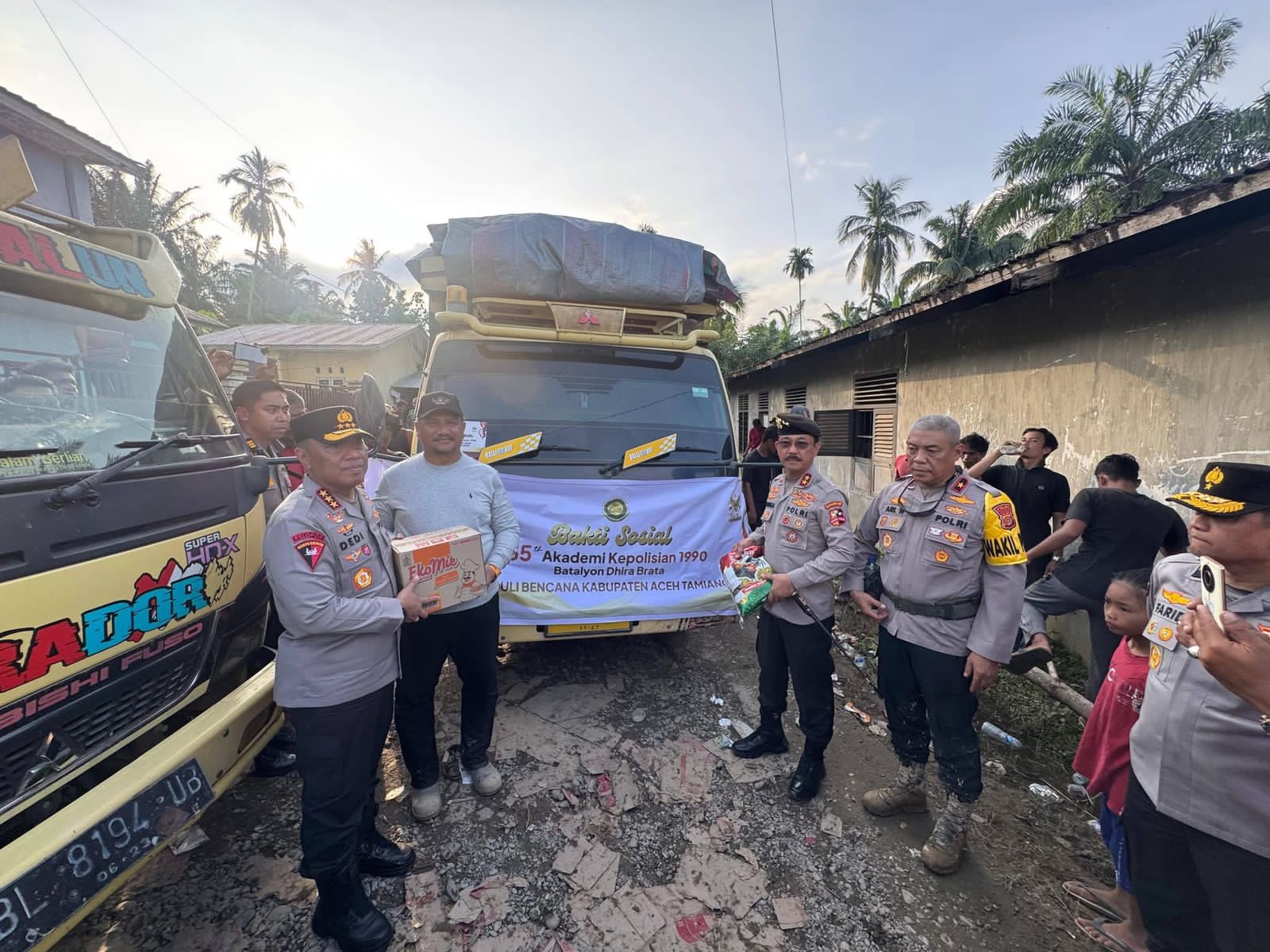Dari sana, Bupati Armia dan Wakapolri bersama rombongan bertolak ke Gudang Lumbung Sosial milik Pemkab, guna penyerahan simbolis bantuan dari Batalyon Dhira Brata abituren Akabri 1990 kepada Pemkab Aceh Tamiang. Bantuan yang diserahkan meliputi bahan makanan serta sejumlah kebutuhan hidup dasar yang akan segera disalurkan kepada para pengungsi korban bencana di Bumi Muda Sedia.