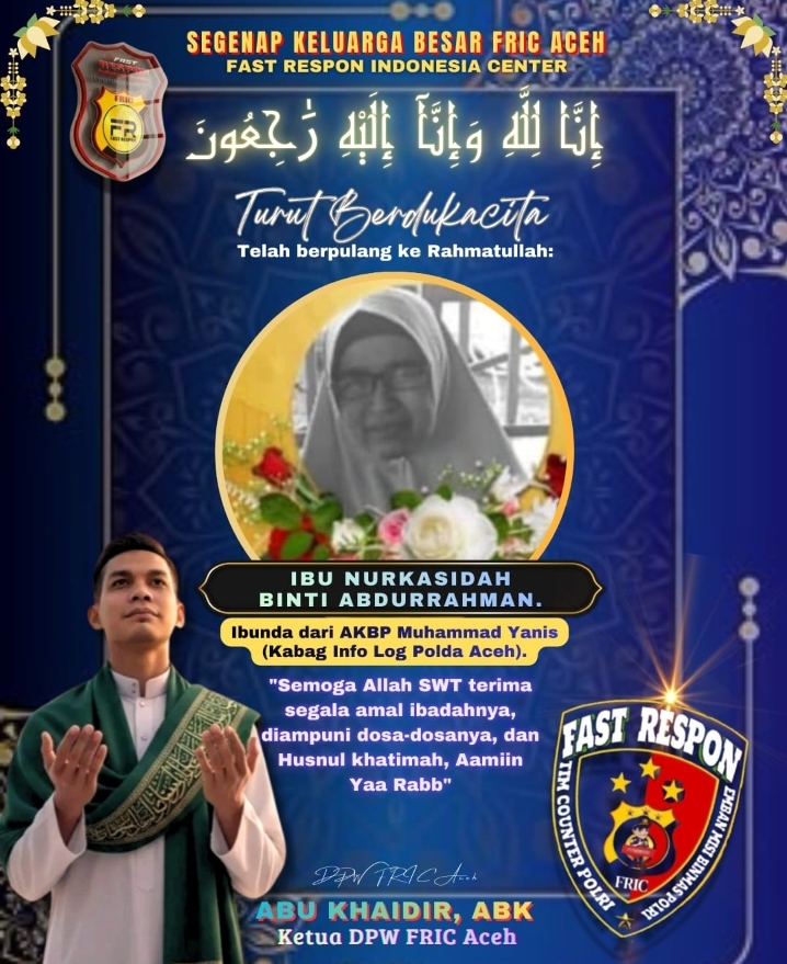 “Kami segenap keluarga besar DPW FRIC Aceh turut berduka cita yang sedalam-dalamnya atas berpulangnya ke Rahmatullah Ibu Nurkasidah binti Abdurrahman, ibunda dari AKBP Muhammad Yanis. Semoga Allah SWT menerima segala amal ibadah almarhumah, mengampuni segala dosa-dosanya, serta menempatkannya di tempat terbaik di sisi-Nya,” ujar Abu Khaidir.