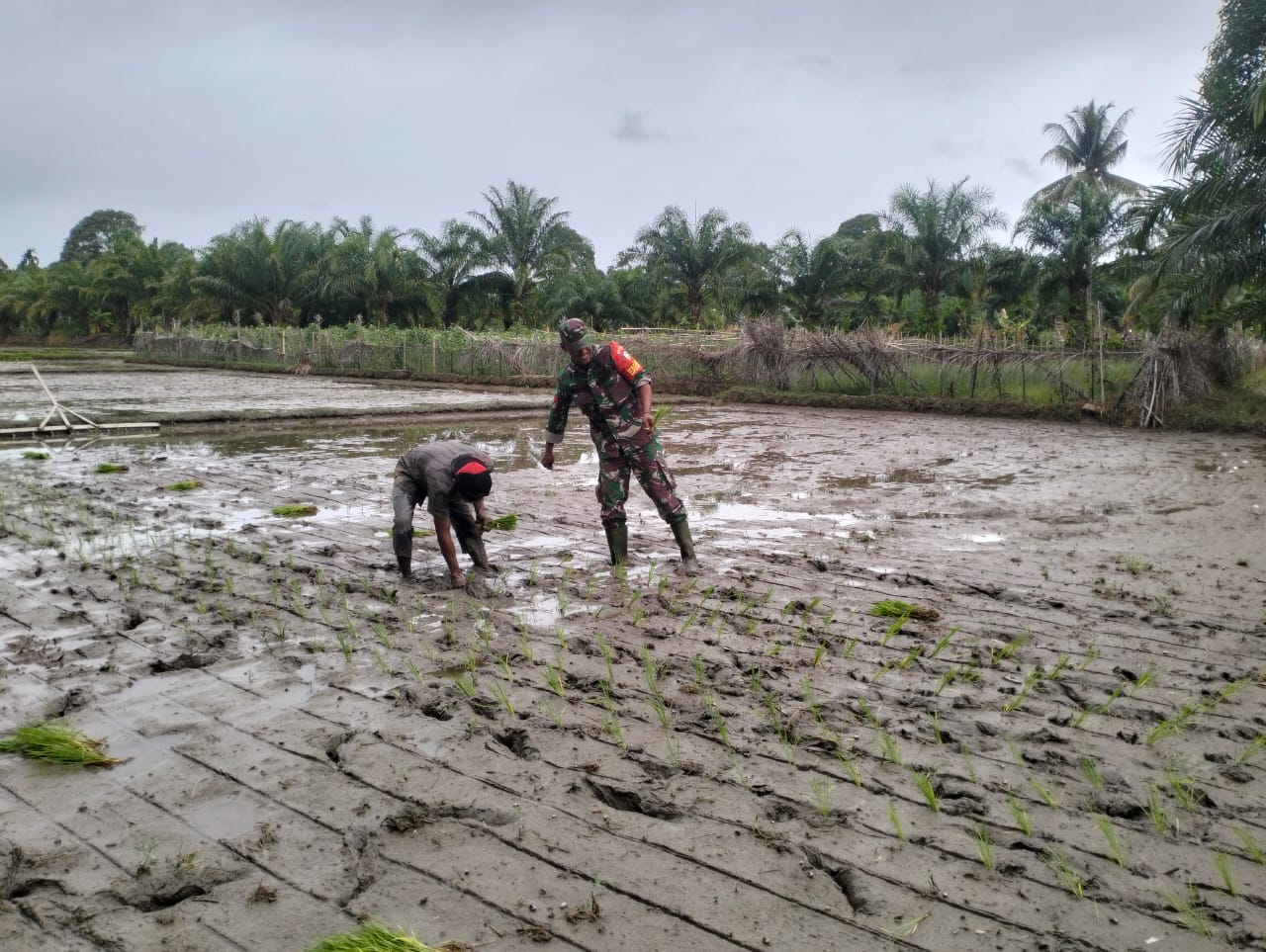 Dukung Peningkatan Produksi Pangan di Babahrot, Babinsa Turun Sawah Bantu Petani Tanam Padi